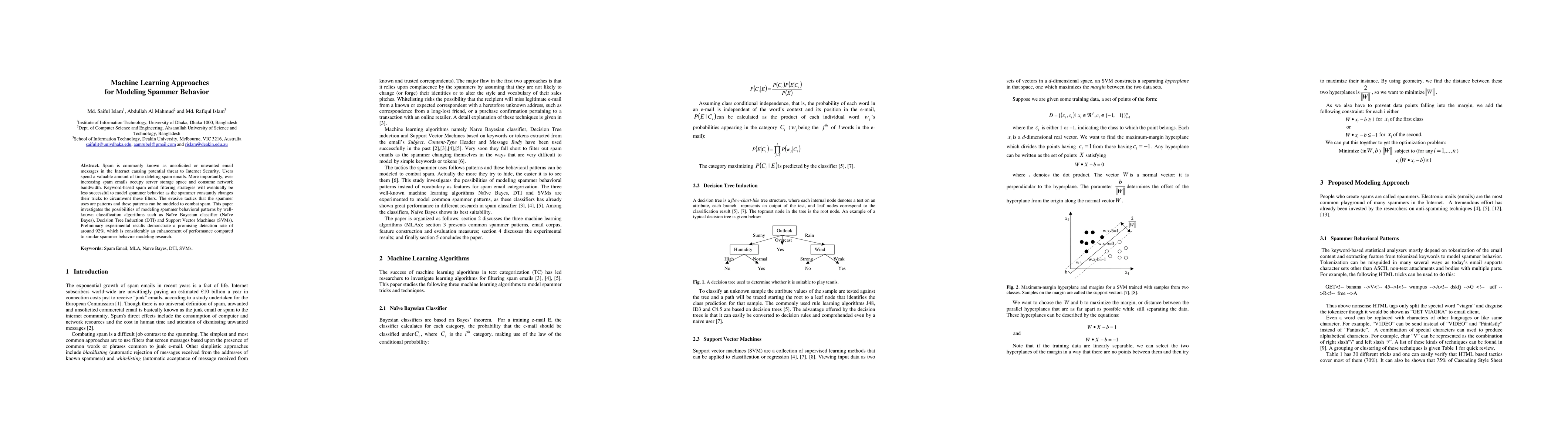 This paper explores machine learning techniques, including Naive Bayes, Decision Tree Induction, and Support Vector Machines, to model spammer behavioral patterns, achieving a detection rate of approximately 92%, surpassing traditional keyword-based filtering methods.