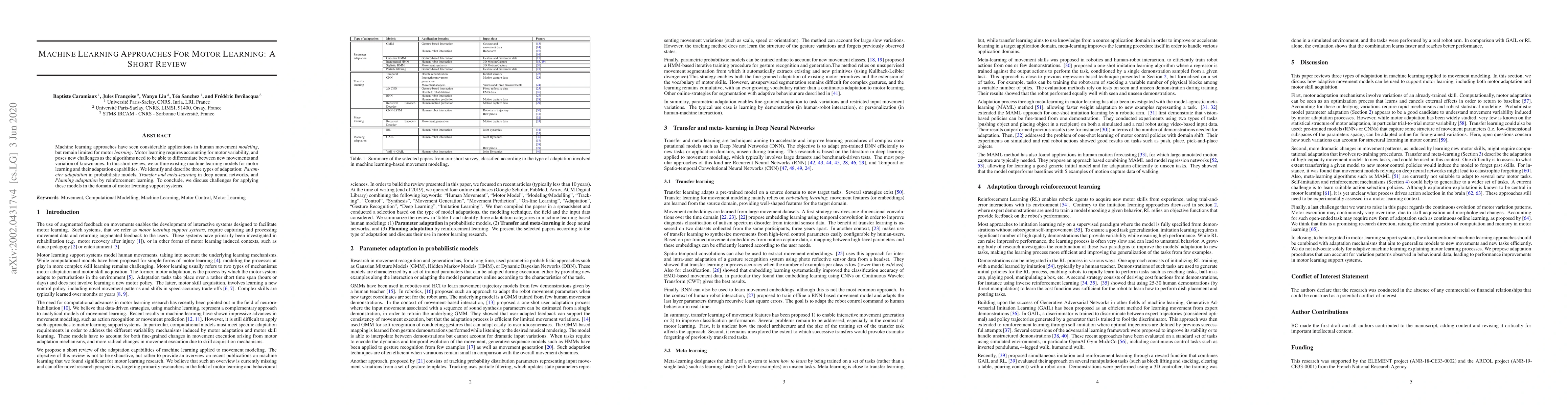 This short review explores machine learning models for motor learning, highlighting three adaptation types: parameter adaptation in probabilistic models, transfer and meta-learning in deep neural networks, and planning adaptation via reinforcement learning. It concludes by identifying challenges for implementing these models in motor learning support systems.