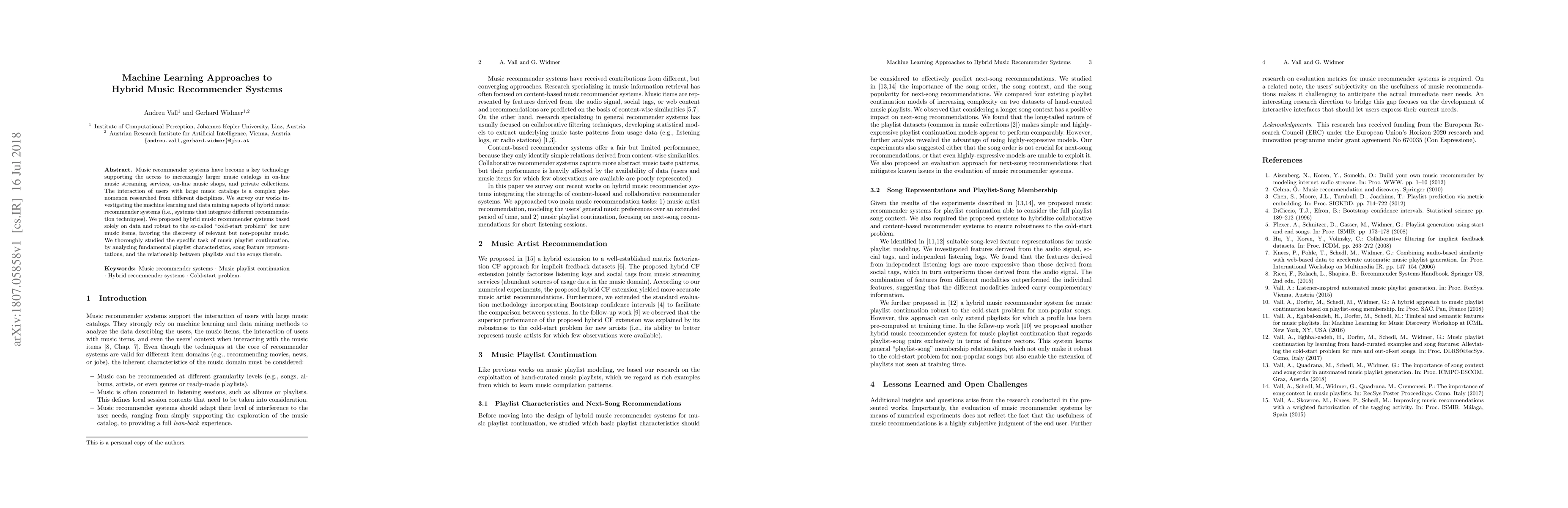 The proposed hybrid CF extension and hybrid music recommender system for playlist continuation made significant technical contributions.