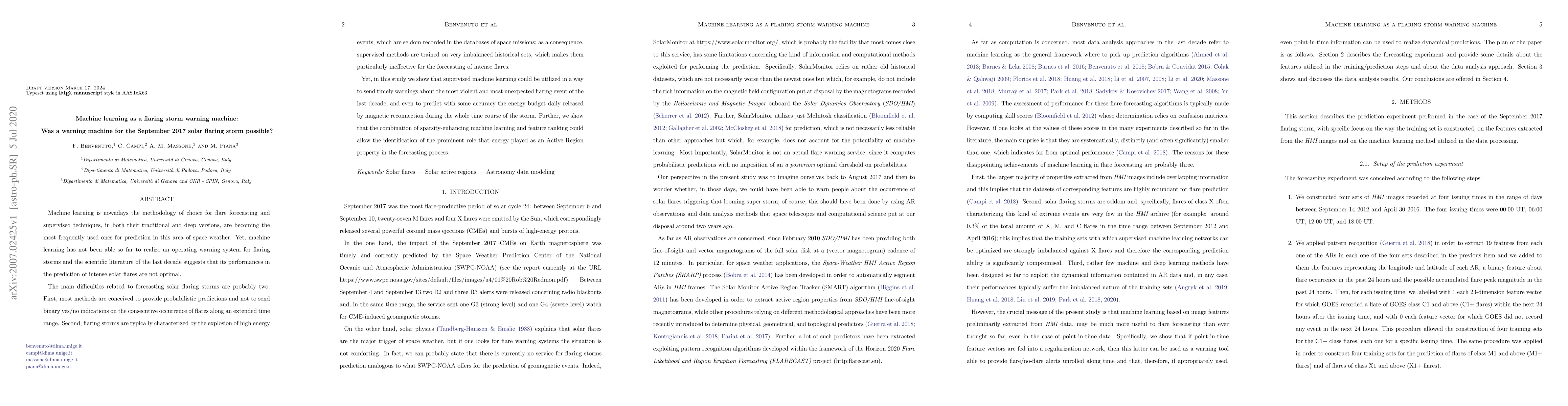 This study explores the potential of supervised machine learning to predict intense solar flares, demonstrating its capability to warn of the September 2017 flaring storm and accurately estimate the energy released during the storm. Despite challenges with imbalanced data and probabilistic predictions, the research highlights the effectiveness of combining sparsity-enhancing techniques and feature ranking for improved forecasting.