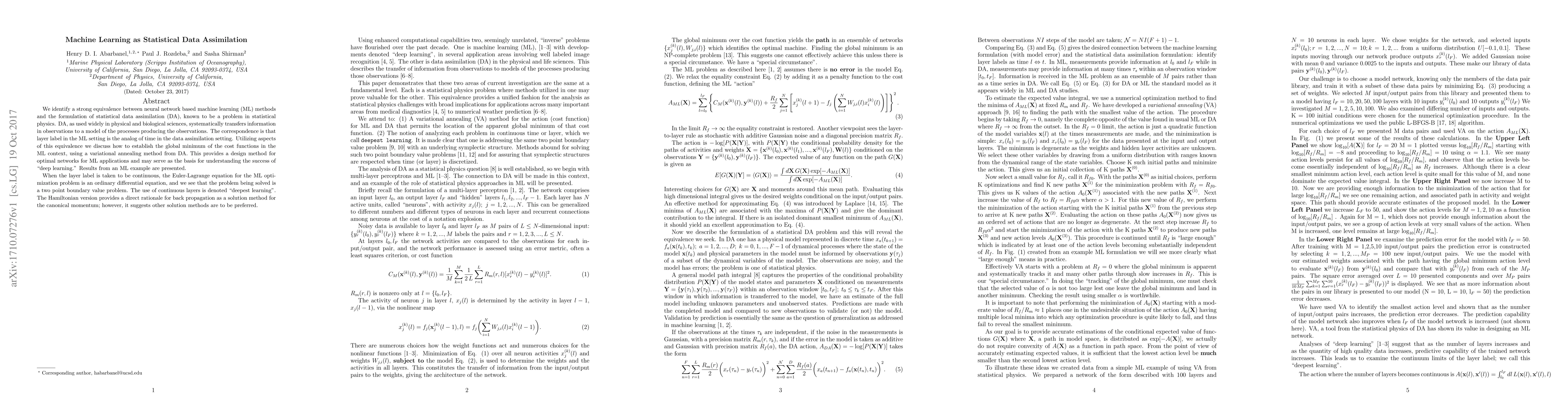 We identify a strong equivalence between neural network based machine learning (ML) methods and the formulation of statistical data assimilation (DA), known to be a problem in statistical physics. DA, as used widely in physical and biological sciences, systematically transfers information in observations to a model of the processes producing the observations. The correspondence is that layer label in the ML setting is the analog of time in the data assimilation setting. Utilizing aspects of this equivalence we discuss how to establish the global minimum of the cost functions in the ML context, using a variational annealing method from DA. This provides a design method for optimal networks for ML applications and may serve as the basis for understanding the success of "deep learning". Results from an ML example are presented. When the layer label is taken to be continuous, the Euler-Lagrange equation for the ML optimization problem is an ordinary differential equation, and we see that the problem being solved is a two point boundary value problem. The use of continuous layers is denoted "deepest learning". The Hamiltonian version provides a direct rationale for back propagation as a solution method for the canonical momentum; however, it suggests other solution methods are to be preferred.