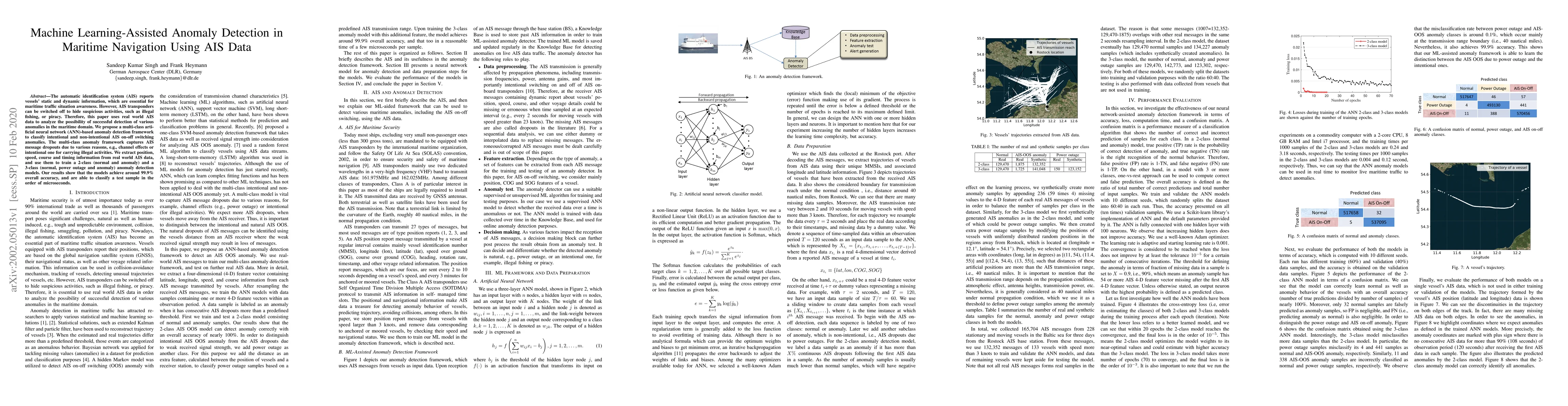 The paper presents a machine learning-assisted anomaly detection framework using a three-layer ANN model for classifying AIS message dropouts into normal, intentional anomalies, and non-intentional anomalies like power outages.