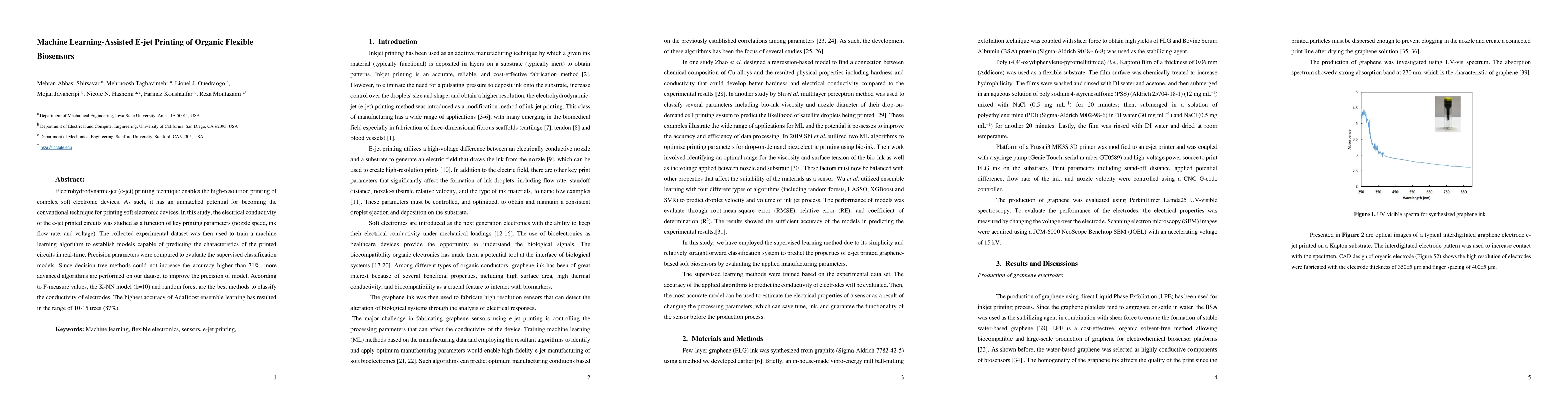 This study explores machine learning-assisted e-jet printing of organic flexible biosensors, focusing on optimizing the electrical conductivity of printed circuits through key parameters. Advanced machine learning models, including K-NN, random forest, and AdaBoost, were employed to predict circuit characteristics, with AdaBoost achieving the highest accuracy of 87% using 10-15 trees.