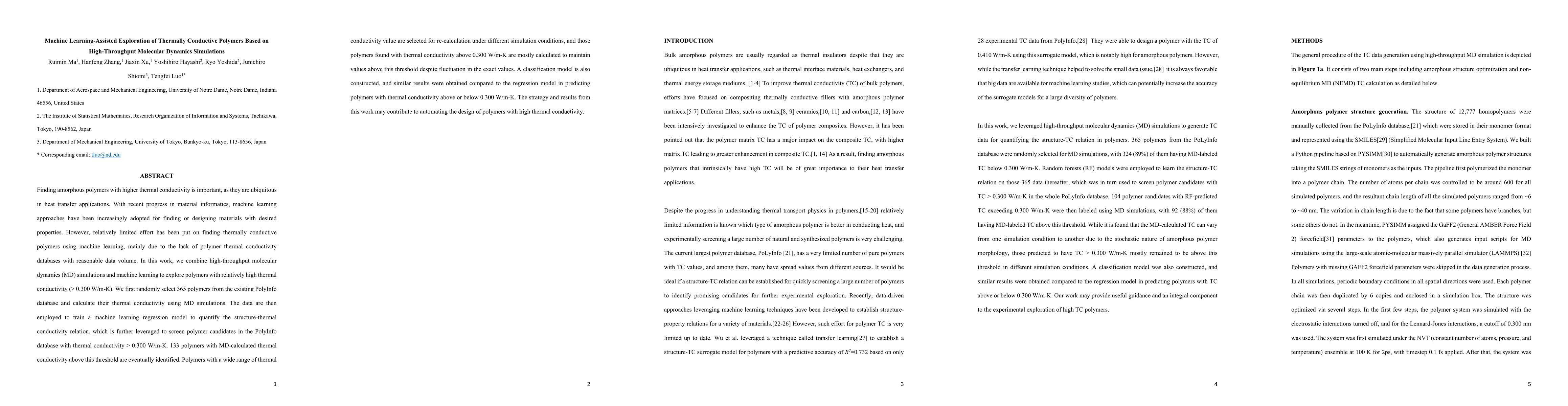 This study combines high-throughput molecular dynamics simulations and machine learning to identify amorphous polymers with high thermal conductivity (> 0.300 W/m-K). Using a regression model trained on MD-calculated data, 133 polymers from the PolyInfo database were screened for high thermal conductivity, demonstrating the potential for automating the design of thermally conductive polymers.