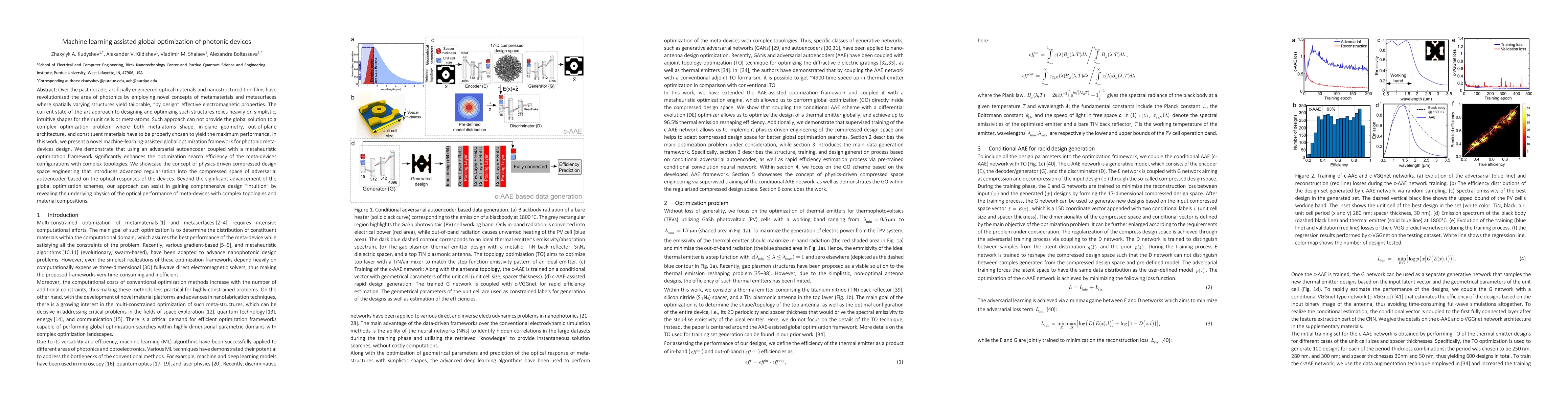 This paper introduces a novel machine-learning-assisted global optimization framework for designing photonic meta-devices, employing an adversarial autoencoder and metaheuristic optimization to enhance search efficiency and reveal underlying optical performance physics. The approach provides a physics-driven compressed design space engineering that significantly improves optimization of complex meta-device configurations.