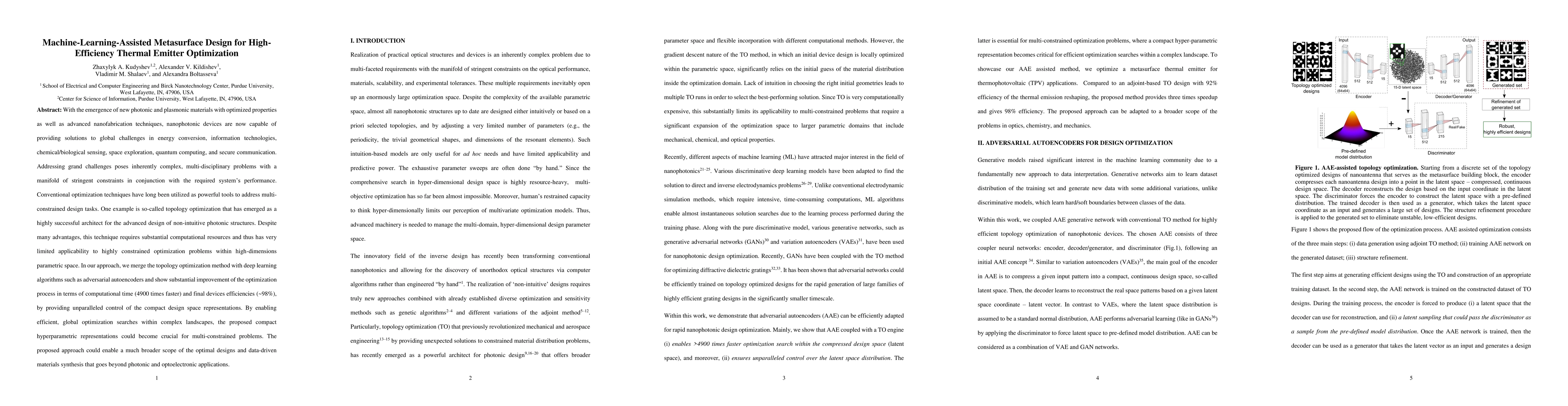 With the emergence of new photonic and plasmonic materials with optimized properties as well as advanced nanofabrication techniques, nanophotonic devices are now capable of providing solutions to global challenges in energy conversion, information technologies, chemical/biological sensing, space exploration, quantum computing, and secure communication. Addressing grand challenges poses inherently complex, multi-disciplinary problems with a manifold of stringent constraints in conjunction with the required system's performance. Conventional optimization techniques have long been utilized as powerful tools to address multi-constrained design tasks. One example is so-called topology optimization that has emerged as a highly successful architect for the advanced design of non-intuitive photonic structures. Despite many advantages, this technique requires substantial computational resources and thus has very limited applicability to highly constrained optimization problems within high-dimensions parametric space. In our approach, we merge the topology optimization method with machine learning algorithms such as adversarial autoencoders and show substantial improvement of the optimization process by providing unparalleled control of the compact design space representations. By enabling efficient, global optimization searches within complex landscapes, the proposed compact hyperparametric representations could become crucial for multi-constrained problems. The proposed approach could enable a much broader scope of the optimal designs and data-driven materials synthesis that goes beyond photonic and optoelectronic applications.