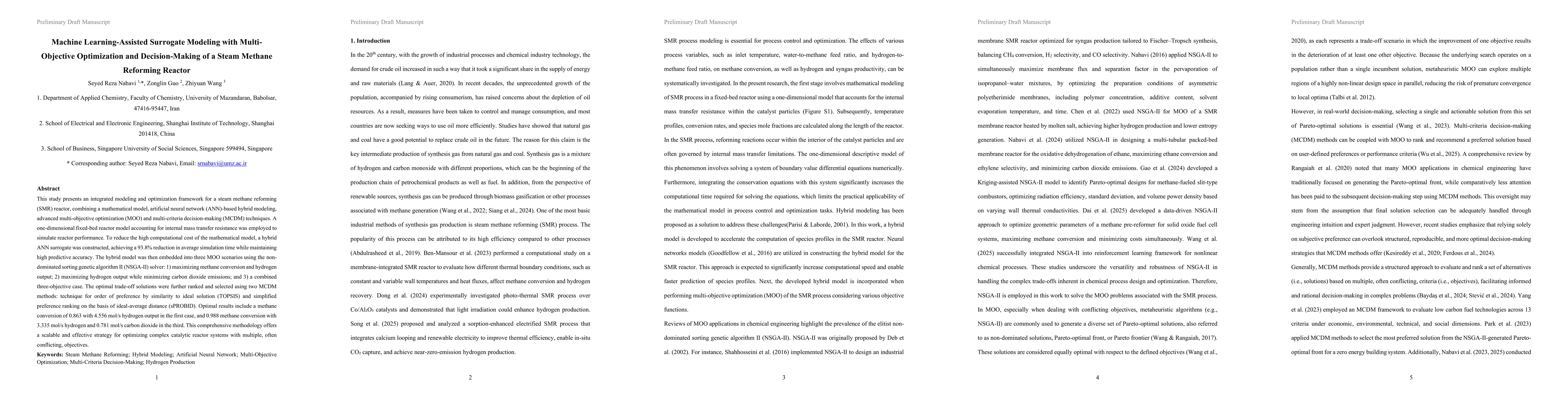 This research introduces a machine learning-assisted optimization framework for steam methane reforming reactors. It combines a mathematical model, an artificial neural network surrogate, and multi-objective optimization with decision-making techniques. The hybrid model reduces computational cost by 93.8% while maintaining accuracy. The framework successfully identifies optimal trade-offs for various objectives, offering a scalable strategy for complex reactor system optimization.