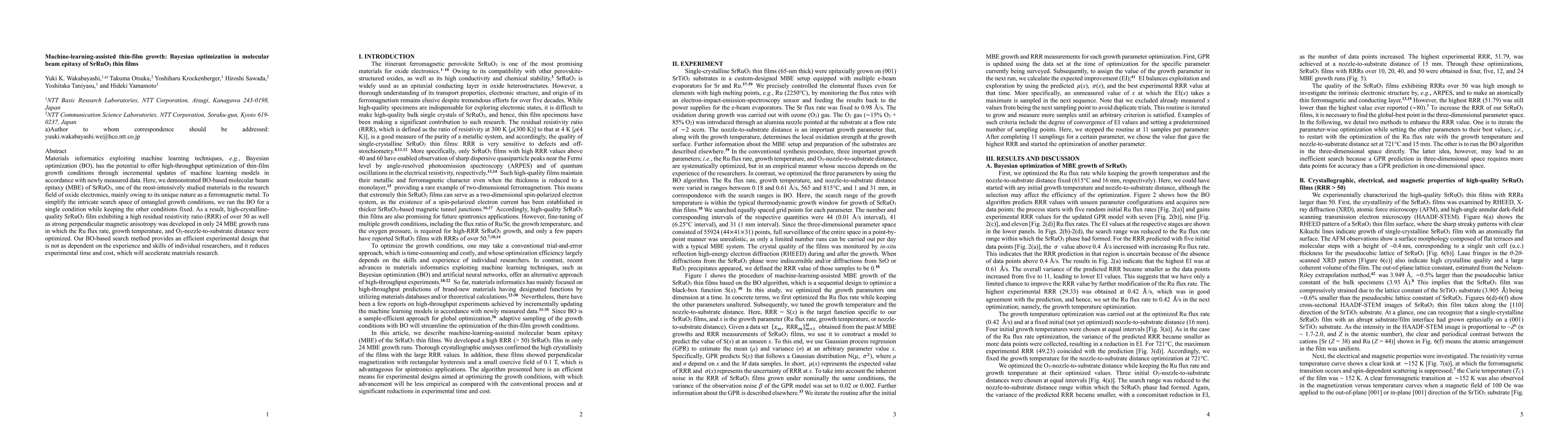 This research demonstrates the use of Bayesian optimization in molecular beam epitaxy for efficient growth of high-quality SrRuO3 thin films, achieving desired properties in just 24 growth runs. The method simplifies complex growth conditions and reduces reliance on researcher expertise, potentially accelerating materials research.