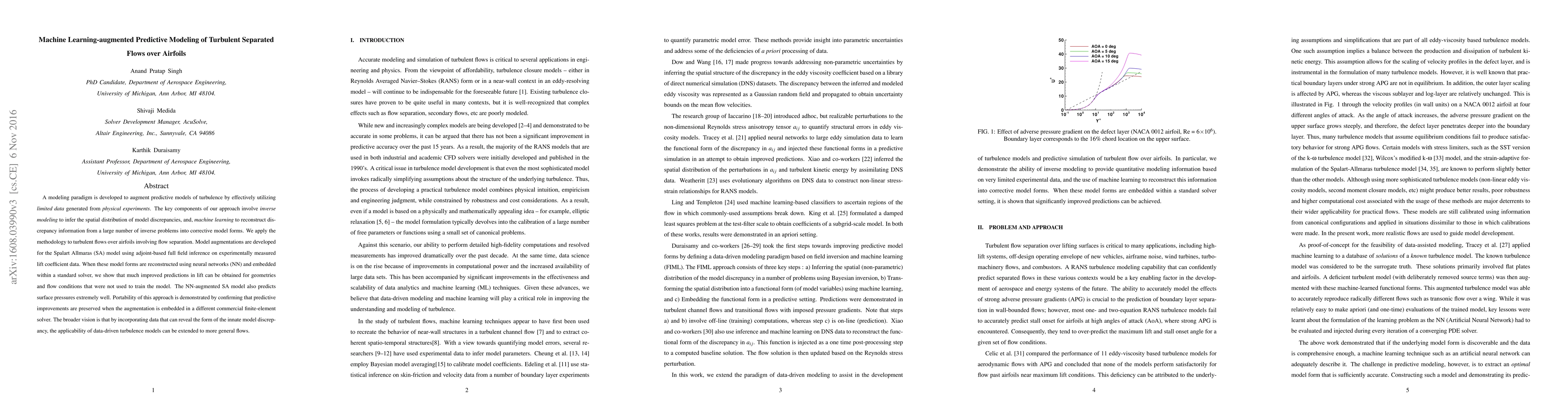 A modeling paradigm is developed to augment predictive models of turbulence by effectively utilizing limited data generated from physical experiments. The key components of our approach involve inverse modeling to infer the spatial distribution of model discrepancies, and, machine learning to reconstruct discrepancy information from a large number of inverse problems into corrective model forms. We apply the methodology to turbulent flows over airfoils involving flow separation. Model augmentations are developed for the Spalart Allmaras (SA) model using adjoint-based full field inference on experimentally measured lift coefficient data. When these model forms are reconstructed using neural networks (NN) and embedded within a standard solver, we show that much improved predictions in lift can be obtained for geometries and flow conditions that were not used to train the model. The NN-augmented SA model also predicts surface pressures extremely well. Portability of this approach is demonstrated by confirming that predictive improvements are preserved when the augmentation is embedded in a different commercial finite-element solver. The broader vision is that by incorporating data that can reveal the form of the innate model discrepancy, the applicability of data-driven turbulence models can be extended to more general flows.