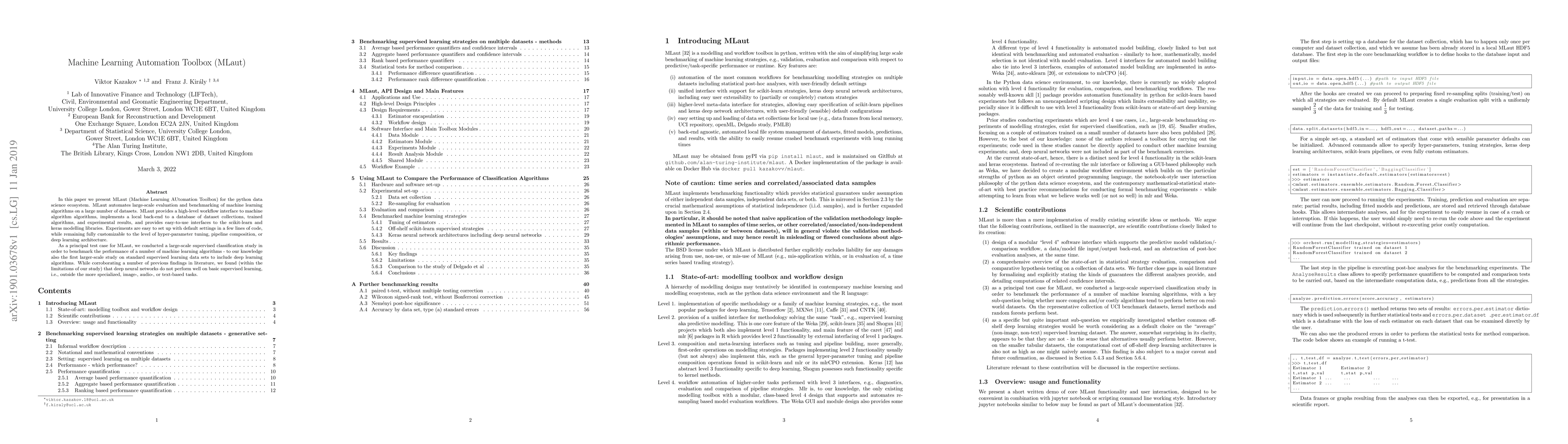 MLaut is a Python toolbox for automating large-scale machine learning algorithm evaluation and benchmarking, integrating with scikit-learn and keras. It conducted a large-scale supervised classification study, finding that deep neural networks generally underperform on basic supervised learning tasks outside specialized domains.