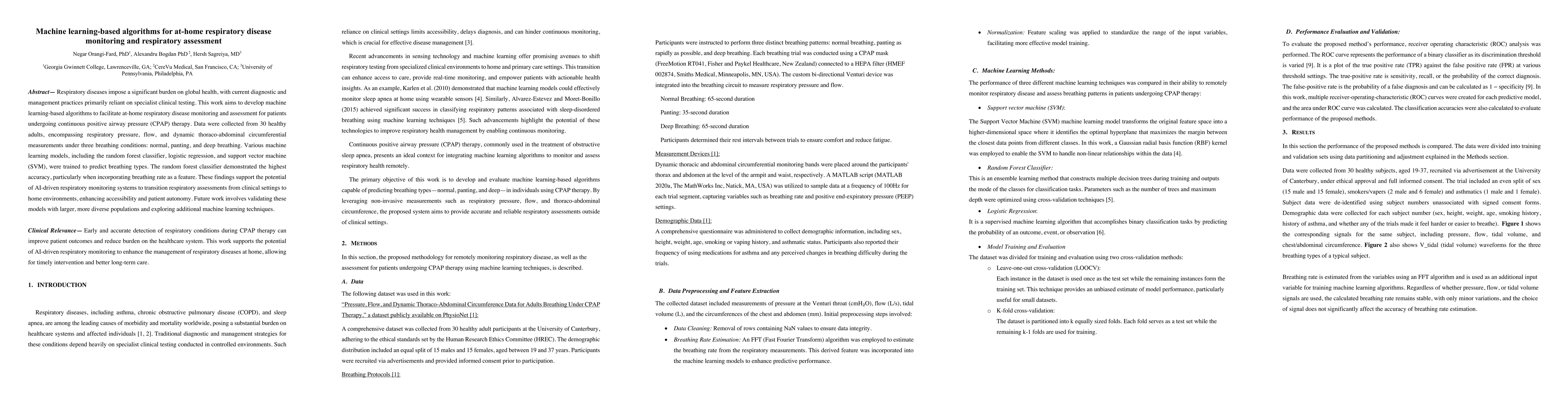 This study develops machine learning algorithms to enable at-home monitoring of respiratory diseases, focusing on patients on CPAP therapy. The random forest classifier showed the highest accuracy in predicting breathing types using data from healthy adults, suggesting the potential for AI-driven respiratory health assessments outside clinical settings.