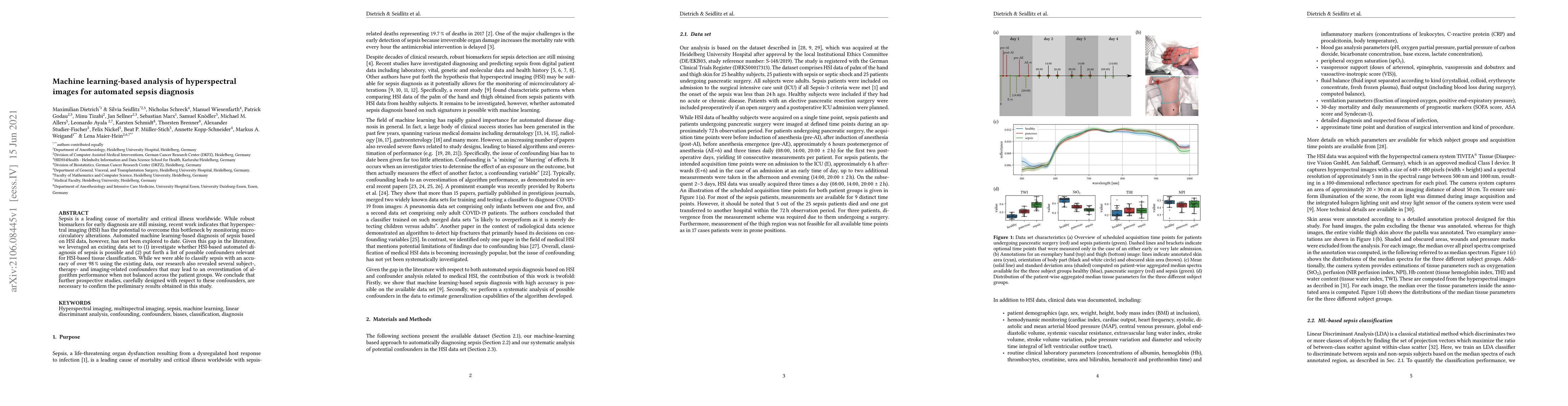 This paper explores the potential of machine learning-based analysis of hyperspectral images for automated sepsis diagnosis, achieving over 98% accuracy. However, it also identifies several confounders that could skew results, emphasizing the need for further studies to confirm these preliminary findings.