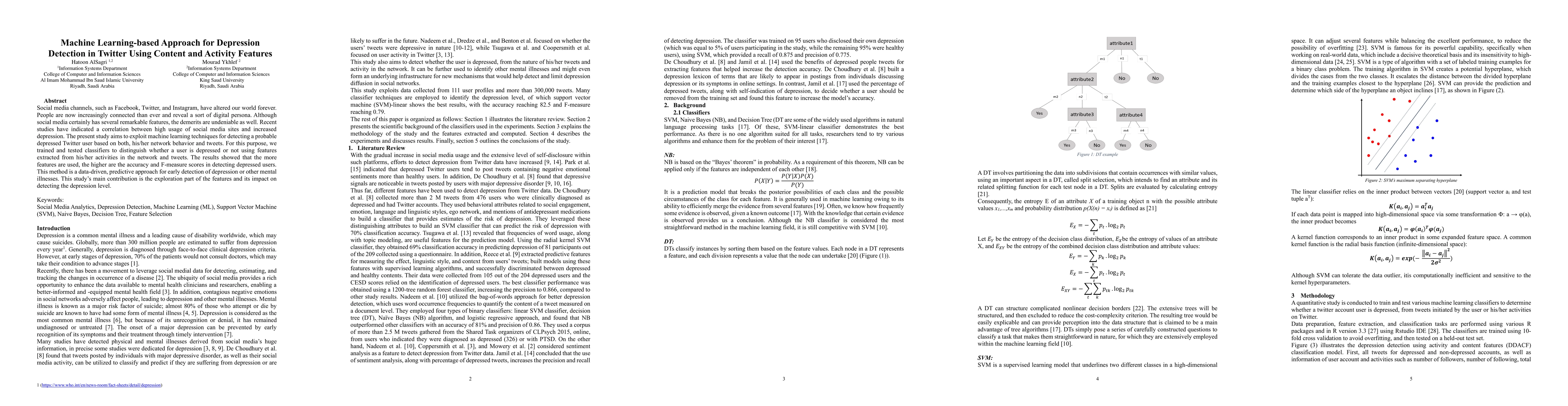 This paper proposes a machine learning-based method to detect depression in Twitter users by analyzing both content and activity features from their tweets and social interactions. The study demonstrates improved accuracy in identifying depressed users with a comprehensive set of features, offering a predictive tool for early mental health intervention.