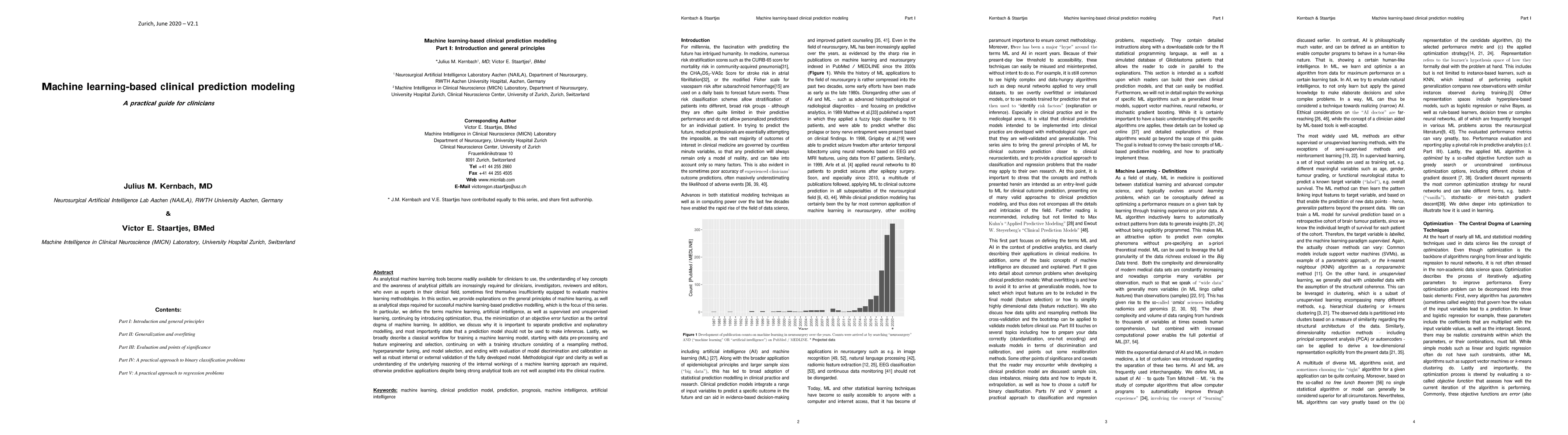 In the emerging era of big data, larger available clinical datasets and computational advances have sparked a massive interest in machine learning-based approaches. The number of manuscripts related to machine learning or artificial intelligence has exponentially increased over the past years. As analytical machine learning tools become readily available for clinicians to use, the understanding of key concepts and the awareness of analytical pitfalls are increasingly required for clinicians, investigators, reviewers and editors, who even as experts in their clinical field, sometimes find themselves insufficiently equipped to evaluate machine learning methodologies. In the first section, we provide explanations on the general principles of machine learning, as well as analytical steps required for successful machine learning-based predictive modelling - which is the focus of this series. In further sections, we review the importance of resampling, overfitting and model generalizability as well as feature reduction and selection (Part II), strategies for model evaluation, reporting and discussion of common caveats and other points of significance (Part III), as well as offer a practical guide to classification (Part IV) and regression modelling (Part V), with a complete coding pipeline. Methodological rigor and clarity as well as understanding of the underlying reasoning of the internal workings of a machine learning approach are required, otherwise predictive applications despite being strong analytical tools are not well accepted into the clinical routine. Going forward, machine learning and artificial intelligence shape and influence modern medicine across disciplines including the field of neurosurgery.