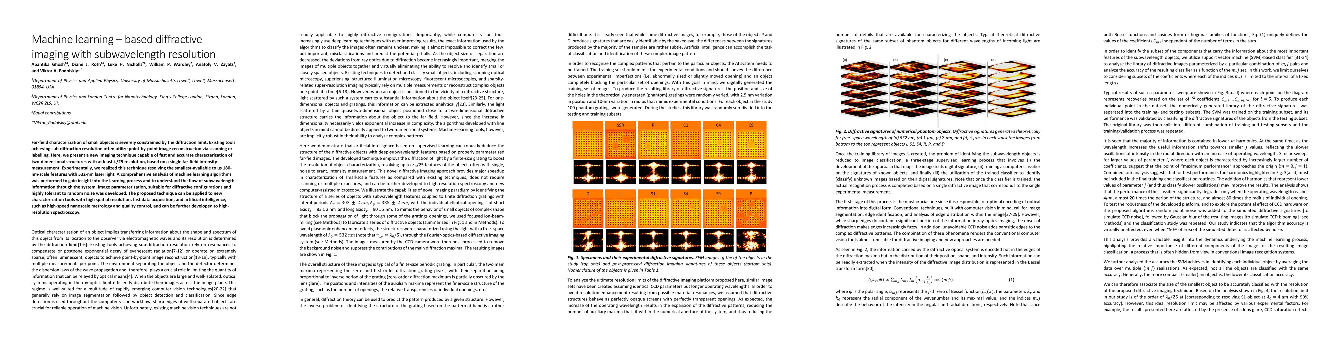 Far-field characterization of small objects is severely constrained by the diffraction limit. Existing tools achieving sub-diffraction resolution often utilize point-by-point image reconstruction via scanning or labelling. Here, we present a new imaging technique capable of fast and accurate characterization of two-dimensional structures with at least wavelength/25 resolution, based on a single far-field intensity measurement. Experimentally, we realized this technique resolving the smallest-available to us 180-nm-scale features with 532-nm laser light. A comprehensive analysis of machine learning algorithms was performed to gain insight into the learning process and to understand the flow of subwavelength information through the system. Image parameterization, suitable for diffractive configurations and highly tolerant to random noise was developed. The proposed technique can be applied to new characterization tools with high spatial resolution, fast data acquisition, and artificial intelligence, such as high-speed nanoscale metrology and quality control, and can be further developed to high-resolution spectroscopy