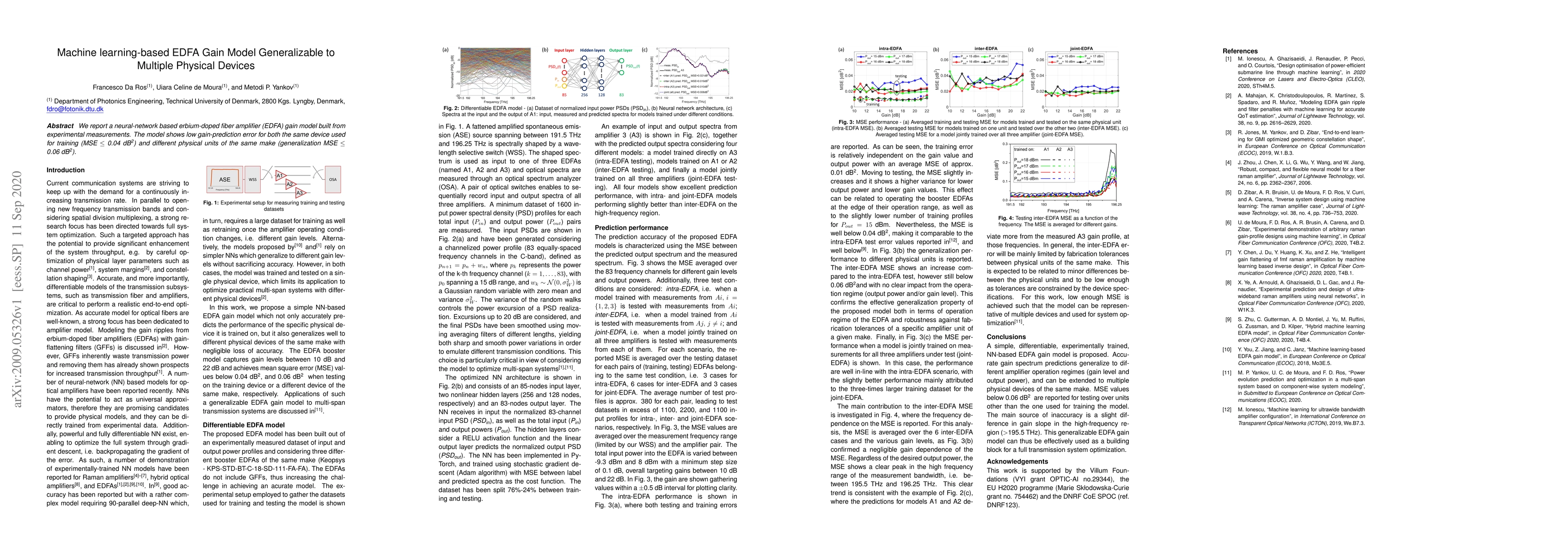 This paper presents a neural-network model for predicting the gain of erbium-doped fiber amplifiers (EDFAs) based on experimental data, demonstrating low prediction error both for the training device and for different physical units of the same type. The model shows generalization with a mean squared error of no more than 0.06 dB².