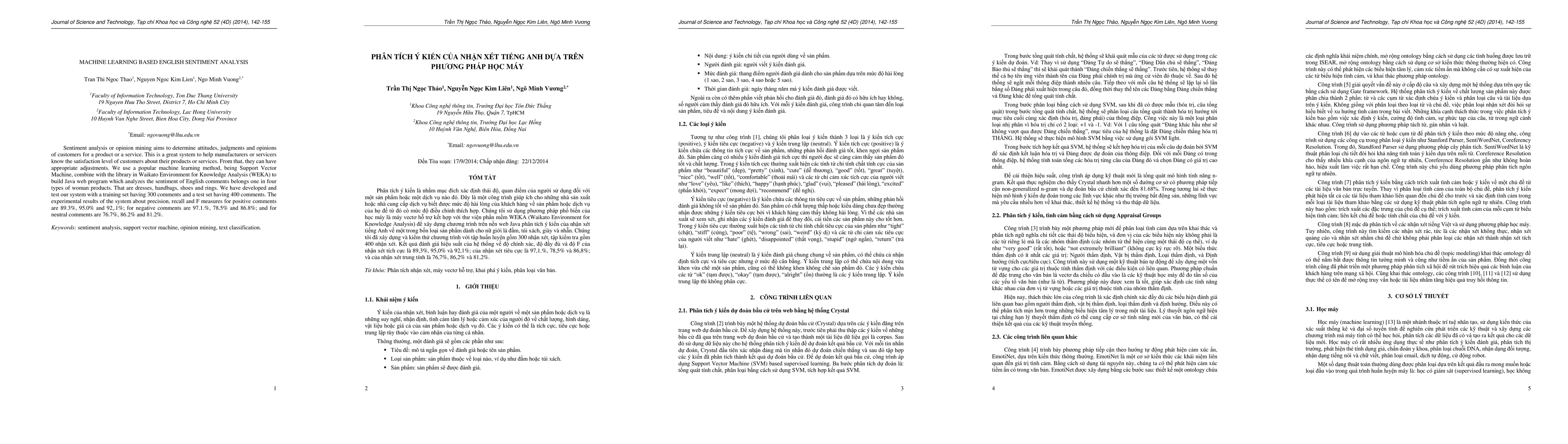 Sentiment analysis or opinion mining aims to determine attitudes, judgments and opinions of customers for a product or a service. This is a great system to help manufacturers or servicers know the satisfaction level of customers about their products or services. From that, they can have appropriate adjustments. We use a popular machine learning method, being Support Vector Machine, combine with the library in Waikato Environment for Knowledge Analysis (WEKA) to build Java web program which analyzes the sentiment of English comments belongs one in four types of woman products. That are dresses, handbags, shoes and rings. We have developed and test our system with a training set having 300 comments and a test set having 400 comments. The experimental results of the system about precision, recall and F measures for positive comments are 89.3%, 95.0% and 92,.1%; for negative comments are 97.1%, 78.5% and 86.8%; and for neutral comments are 76.7%, 86.2% and 81.2%.