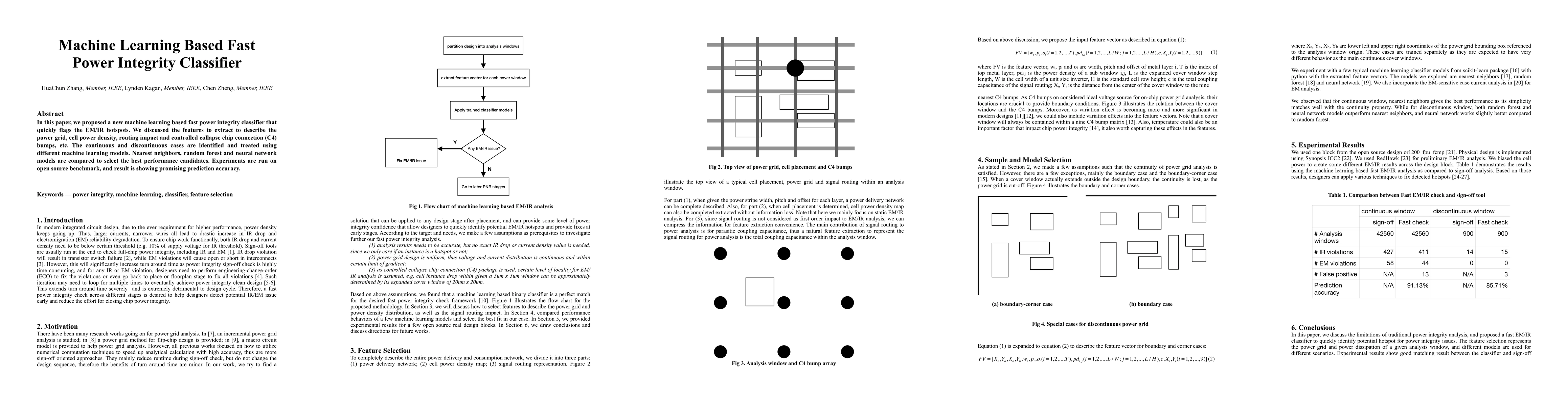 A machine learning based fast power integrity classifier was proposed to quickly flag EM/IR hotspots in power grids.