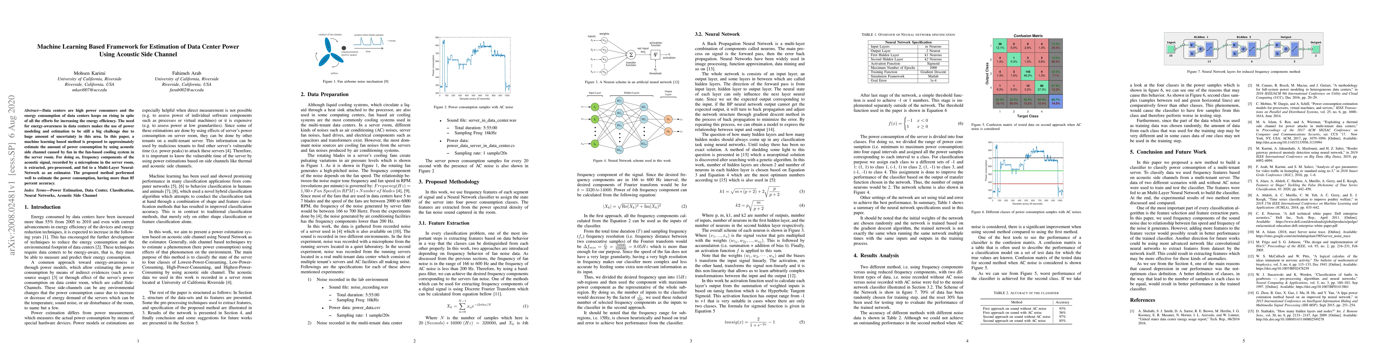 This paper proposes a machine learning framework using acoustic side channels to estimate data center power consumption. The method extracts and processes acoustic signals from server room fans, feeding them into a Multi-Layer Neural-Network for accurate power estimation, achieving over 85 percent accuracy.
