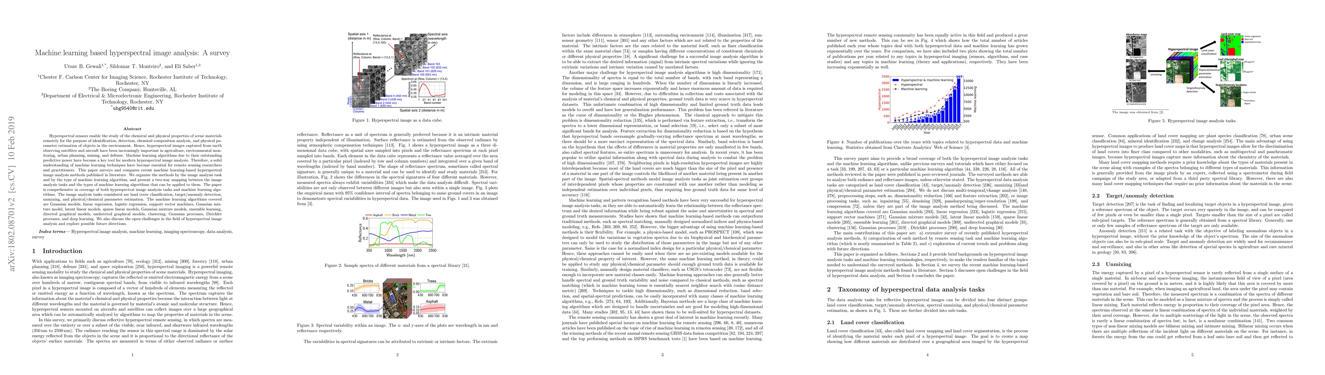 This paper surveys recent machine learning techniques for hyperspectral image analysis, categorizing methods by image analysis tasks such as land cover classification and target detection, and by machine learning algorithms including deep learning and support vector machines. It also discusses current challenges and future directions in the field.