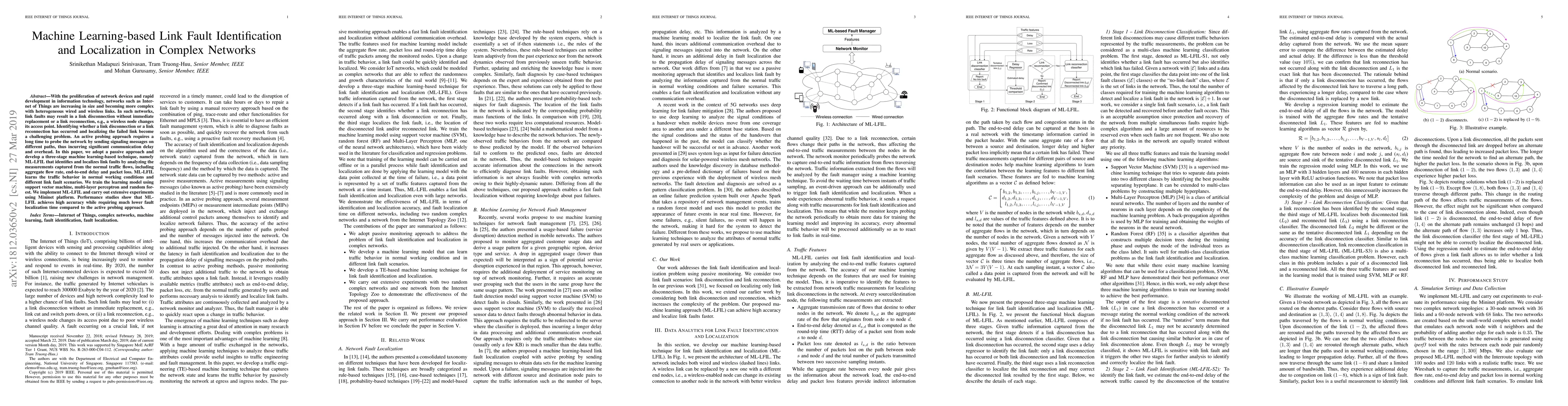 With the proliferation of network devices and rapid development in information technology, networks such as Internet of Things are increasing in size and becoming more complex with heterogeneous wired and wireless links. In such networks, link faults may result in a link disconnection without immediate replacement or a link reconnection, e.g., a wireless node changes its access point. Identifying whether a link disconnection or a link reconnection has occurred and localizing the failed link become a challenging problem. An active probing approach requires a long time to probe the network by sending signaling messages on different paths, thus incurring significant communication delay and overhead. In this paper, we adopt a passive approach and develop a three-stage machine learning-based technique, namely ML-LFIL that identifies and localizes link faults by analyzing the measurements captured from the normal traffic flows, including aggregate flow rate, end-to-end delay and packet loss. ML-LFIL learns the traffic behavior in normal working conditions and different link fault scenarios. We train the learning model using support vector machine, multi-layer perceptron and random forest. We implement ML-LFIL and carry out extensive experiments using Mininet platform. Performance studies show that ML-LFIL achieves high accuracy while requiring much lower fault localization time compared to the active probing approach.