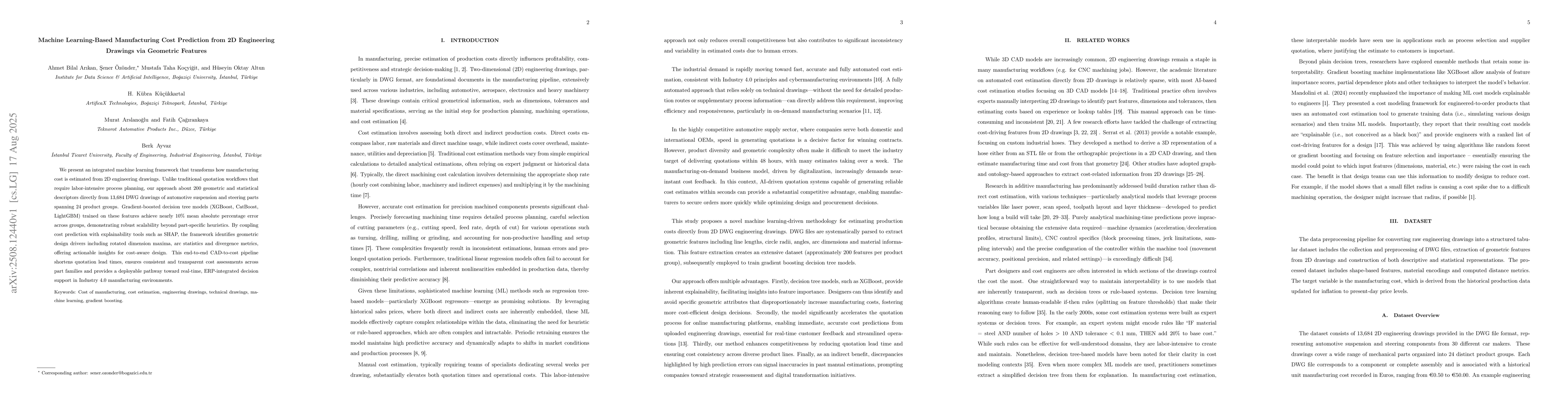 We present an integrated machine learning framework that transforms how manufacturing cost is estimated from 2D engineering drawings. Unlike traditional quotation workflows that require labor-intensive process planning, our approach about 200 geometric and statistical descriptors directly from 13,684 DWG drawings of automotive suspension and steering parts spanning 24 product groups. Gradient-boosted decision tree models (XGBoost, CatBoost, LightGBM) trained on these features achieve nearly 10% mean absolute percentage error across groups, demonstrating robust scalability beyond part-specific heuristics. By coupling cost prediction with explainability tools such as SHAP, the framework identifies geometric design drivers including rotated dimension maxima, arc statistics and divergence metrics, offering actionable insights for cost-aware design. This end-to-end CAD-to-cost pipeline shortens quotation lead times, ensures consistent and transparent cost assessments across part families and provides a deployable pathway toward real-time, ERP-integrated decision support in Industry 4.0 manufacturing environments.