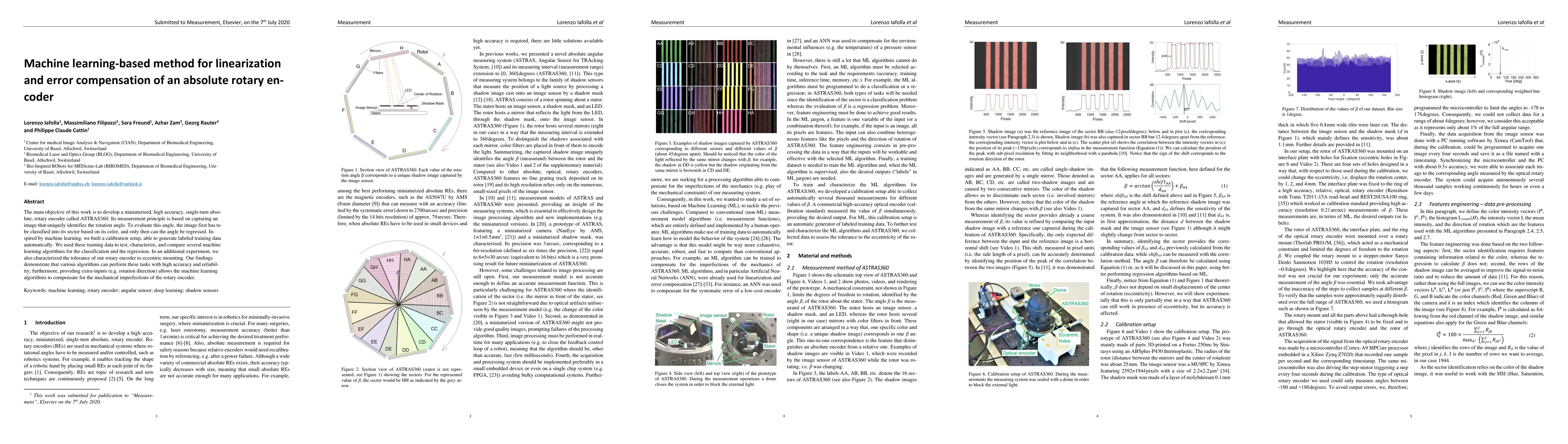 The main objective of this work is to develop a miniaturized, high accuracy, single-turn absolute, rotary encoder called ASTRAS360. Its measurement principle is based on capturing an image that uniquely identifies the rotation angle. To evaluate this angle, the image first has to be classified into its sector based on its color, and only then can the angle be regressed. In-spired by machine learning, we built a calibration setup, able to generate labeled training data automatically. We used these training data to test, characterize, and compare several machine learning algorithms for the classification and the regression. In an additional experiment, we also characterized the tolerance of our rotary encoder to eccentric mounting. Our findings demonstrate that various algorithms can perform these tasks with high accuracy and reliability; furthermore, providing extra-inputs (e.g. rotation direction) allows the machine learning algorithms to compensate for the mechanical imperfections of the rotary encoder.