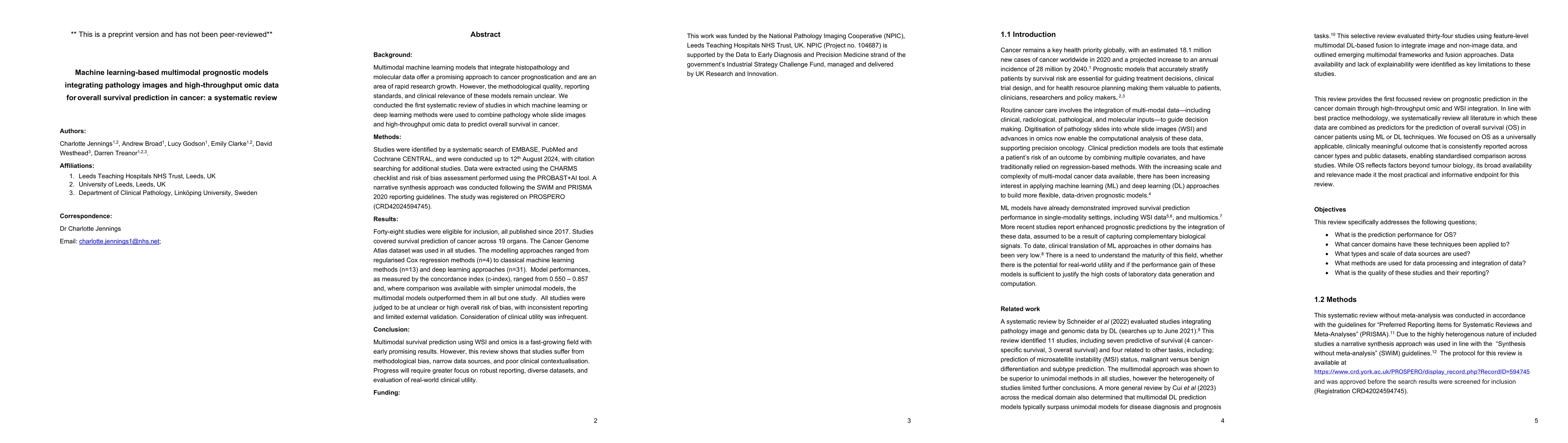 Multimodal machine learning integrating histopathology and molecular data shows promise for cancer prognostication. We systematically reviewed studies combining whole slide images (WSIs) and high-throughput omics to predict overall survival. Searches of EMBASE, PubMed, and Cochrane CENTRAL (12/08/2024), plus citation screening, identified eligible studies. Data extraction used CHARMS; bias was assessed with PROBAST+AI; synthesis followed SWiM and PRISMA 2020. Protocol: PROSPERO (CRD42024594745). Forty-eight studies (all since 2017) across 19 cancer types met criteria; all used The Cancer Genome Atlas. Approaches included regularised Cox regression (n=4), classical ML (n=13), and deep learning (n=31). Reported c-indices ranged 0.550-0.857; multimodal models typically outperformed unimodal ones. However, all studies showed unclear/high bias, limited external validation, and little focus on clinical utility. Multimodal WSI-omics survival prediction is a fast-growing field with promising results but needs improved methodological rigor, broader datasets, and clinical evaluation. Funded by NPIC, Leeds Teaching Hospitals NHS Trust, UK (Project 104687), supported by UKRI Industrial Strategy Challenge Fund.