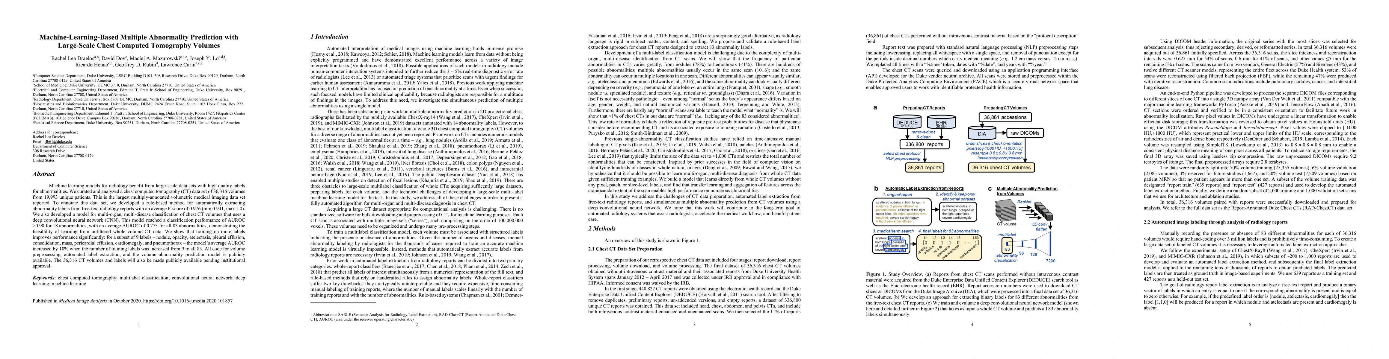 This paper presents a large-scale, multiply-annotated chest CT dataset of 36,316 volumes from 19,993 patients, the largest of its kind. A deep CNN model achieved high AUROC scores for multi-organ, multi-disease classification, demonstrating the potential of machine learning in analyzing whole volume CT data.