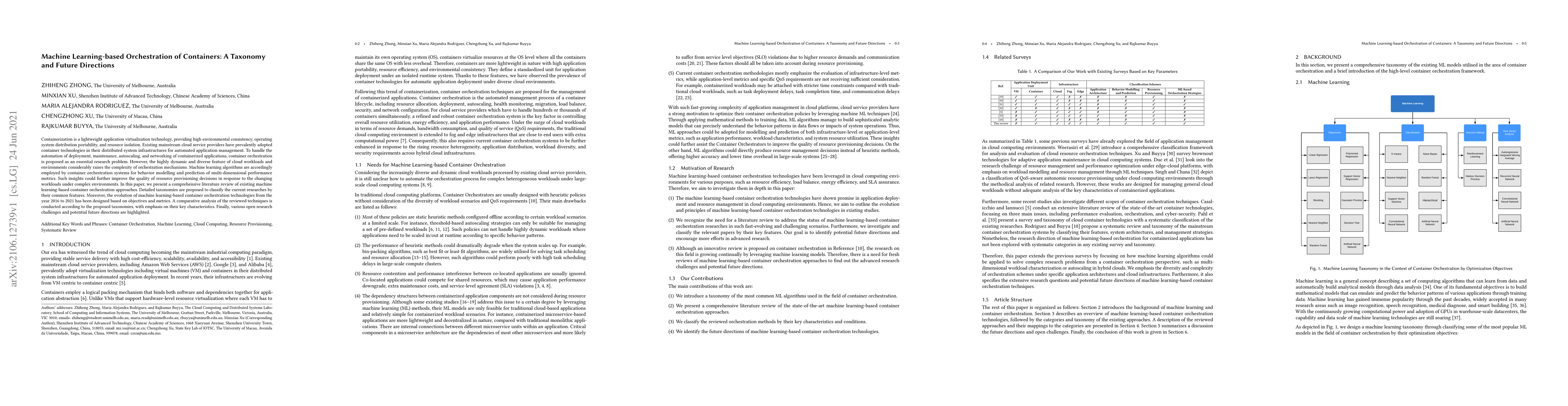 This paper reviews machine learning-based container orchestration techniques, proposing a taxonomy to classify existing approaches based on their features and evolution from 2016 to 2021. It highlights open challenges and future research directions to improve the automation and management of containerized applications.