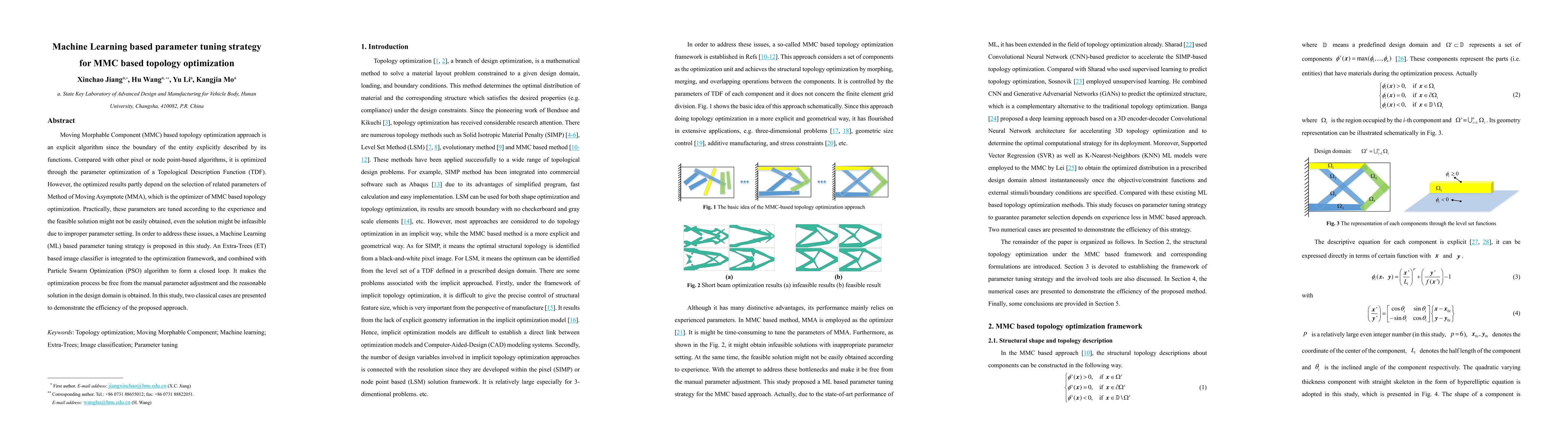 This paper proposes a Machine Learning-based parameter tuning strategy for optimizing Moving Morphable Component (MMC) topology optimization, integrating an Extra-Trees classifier and Particle Swarm Optimization to automate parameter adjustment. The method aims to improve the efficiency of topology optimization by eliminating the need for manual parameter tuning.
