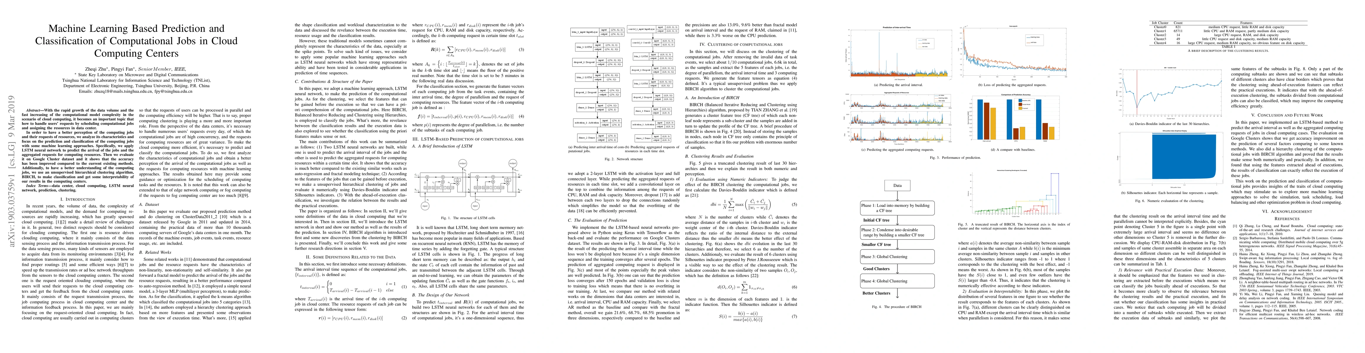 This paper employs machine learning techniques to predict and classify computational jobs in cloud computing centers. It uses an LSTM neural network to improve job arrival and resource request predictions, showing better accuracy on the Google Cluster dataset compared to existing methods. Additionally, it applies BIRCH clustering for job classification, enhancing interpretability.