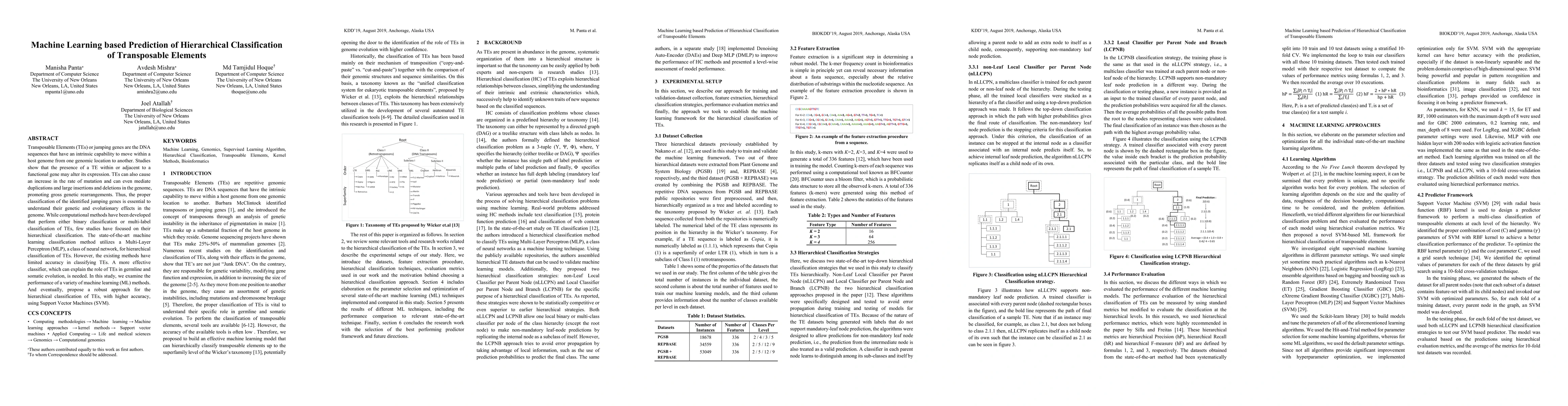 This paper investigates machine learning methods for the hierarchical classification of transposable elements (TEs), aiming to improve accuracy over existing neural network-based approaches. The study proposes a robust classification method using Support Vector Machines (SVM) to better understand TEs' genetic and evolutionary impacts.