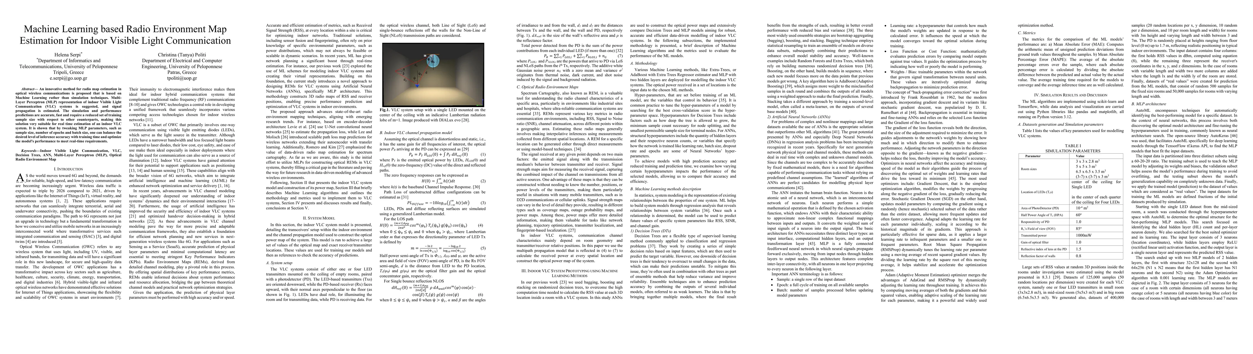 An innovative method for radio map estimation in optical wireless communications is proposed that is based on Machine Learning rather than simulation techniques. Multi-Layer Perceptron (MLP) representation of indoor Visible Light Communication (VLC) systems is suggested, and signal propagation is estimated. The simulation and performance predictions are accurate, fast and require a reduced set of training sample size with respect to other counterparts, making this solution very suitable for real time estimation of an indoor VLC system. It is shown that by tweaking MLP parameters, such as sample size, number of epochs and batch size, one can balance the desired level of inference accuracy with training time and optimize the model's performance to meet real-time requirements.