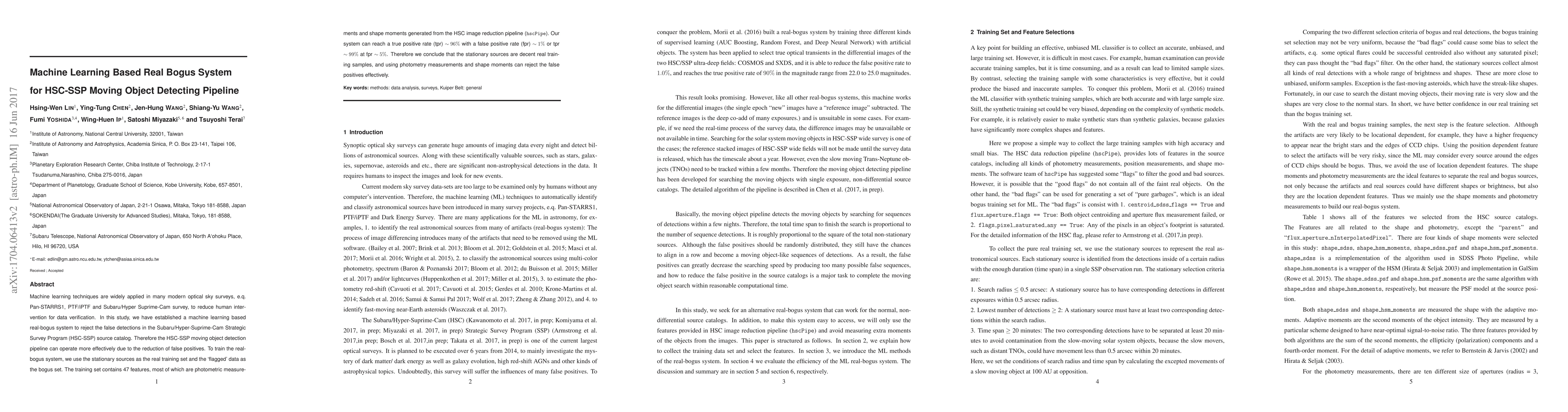 This study develops a machine learning-based system to reduce false positives in the Subaru/Hyper-Suprime-Cam StrategicSurvey Program (HSC-SSP) moving object detection pipeline, achieving high true positive rates with low false positive rates.