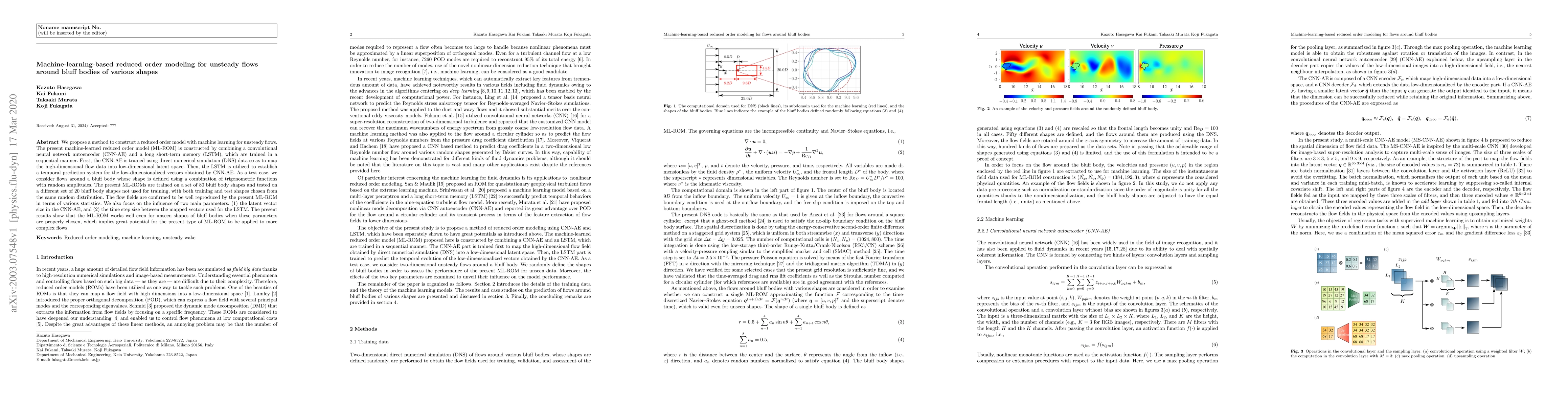 This paper proposes a machine learning-based reduced order model (ML-ROM) combining a convolutional neural network autoencoder (CNN-AE) and a long short-term memory (LSTM) to predict unsteady flows around bluff bodies of various shapes. The model effectively reproduces flow fields and demonstrates good generalization to unseen bluff body shapes when key parameters are appropriately set.