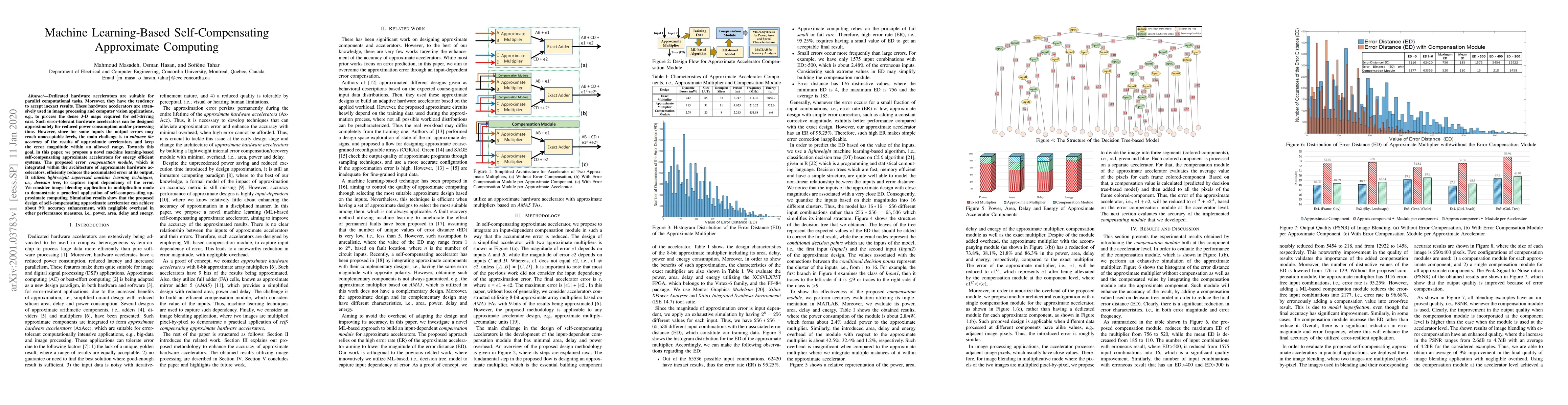 This paper proposes a machine learning-based self-compensating approximate accelerator to enhance the accuracy of error-tolerant hardware for applications like image processing. The design integrates a compensation module using decision trees to reduce accumulated errors, achieving a 9% accuracy improvement with minimal performance overhead.