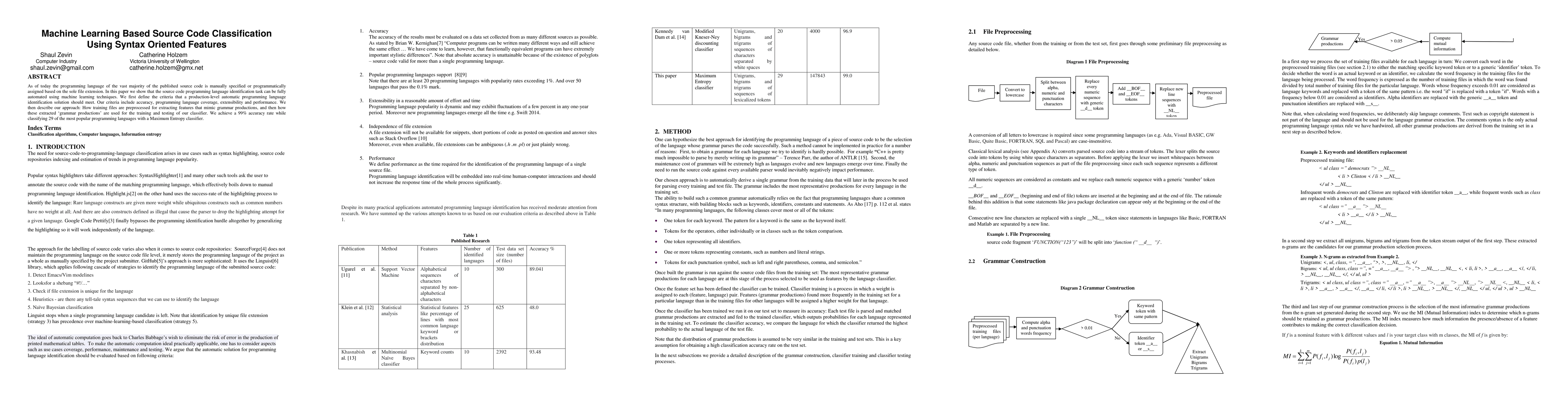 This paper automates the identification of programming languages in source code using machine learning, achieving 99 percent accuracy in classifying 29 popular languages. The approach involves preprocessing training files to extract syntax-oriented features mimicking grammar productions, which are then used to train a Maximum Entropy classifier.