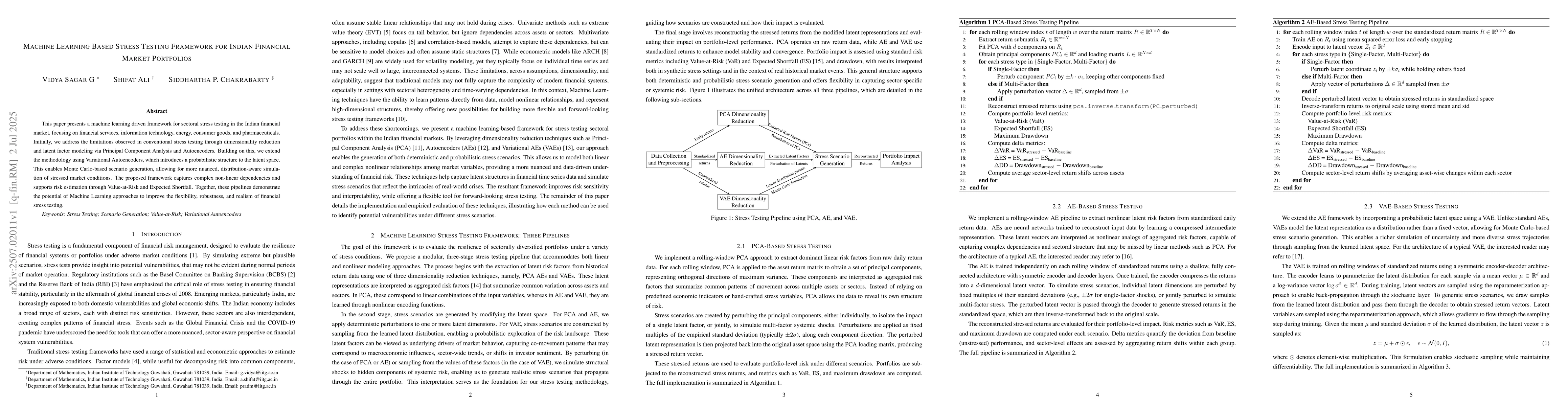 This paper presents a machine learning driven framework for sectoral stress testing in the Indian financial market, focusing on financial services, information technology, energy, consumer goods, and pharmaceuticals. Initially, we address the limitations observed in conventional stress testing through dimensionality reduction and latent factor modeling via Principal Component Analysis and Autoencoders. Building on this, we extend the methodology using Variational Autoencoders, which introduces a probabilistic structure to the latent space. This enables Monte Carlo-based scenario generation, allowing for more nuanced, distribution-aware simulation of stressed market conditions. The proposed framework captures complex non-linear dependencies and supports risk estimation through Value-at-Risk and Expected Shortfall. Together, these pipelines demonstrate the potential of Machine Learning approaches to improve the flexibility, robustness, and realism of financial stress testing.