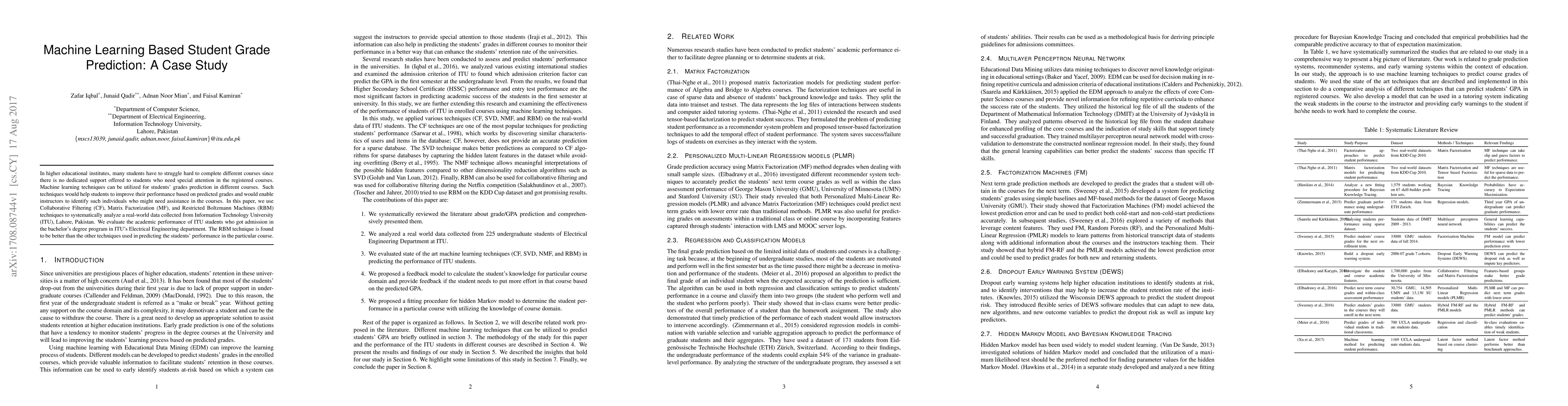This paper explores the use of machine learning techniques, including Collaborative Filtering, Matrix Factorization, and Restricted Boltzmann Machines, to predict student grades in courses at Information Technology University. The study finds that Restricted Boltzmann Machines provide the most accurate predictions, aiding both students and instructors in identifying those who may need additional support.
