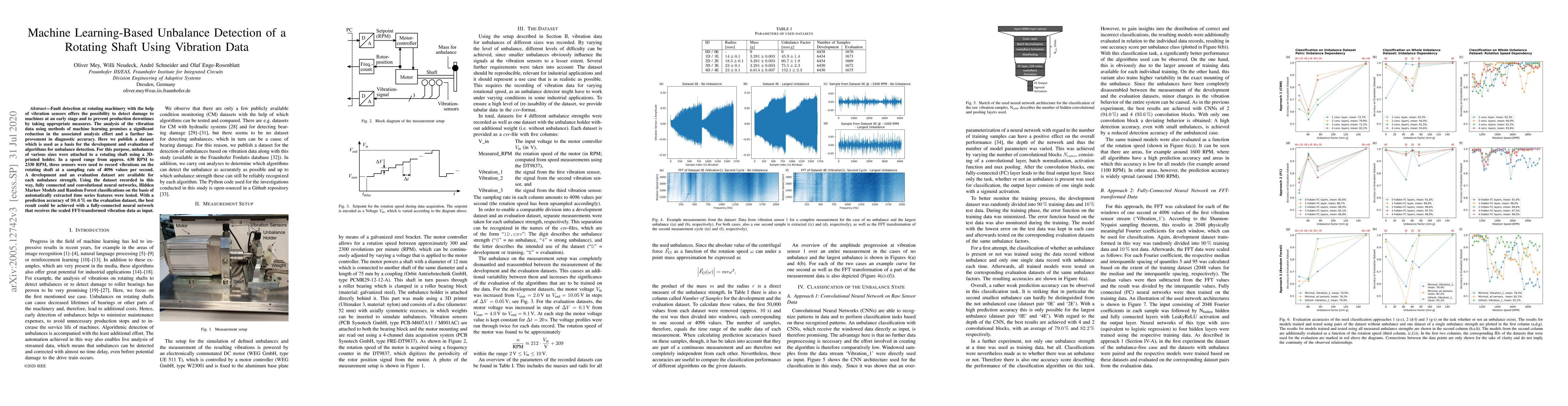 A machine learning-based approach was developed to detect unbalance in a rotating shaft using vibration data, achieving a prediction accuracy of 98.6% with fully-connected neural networks.