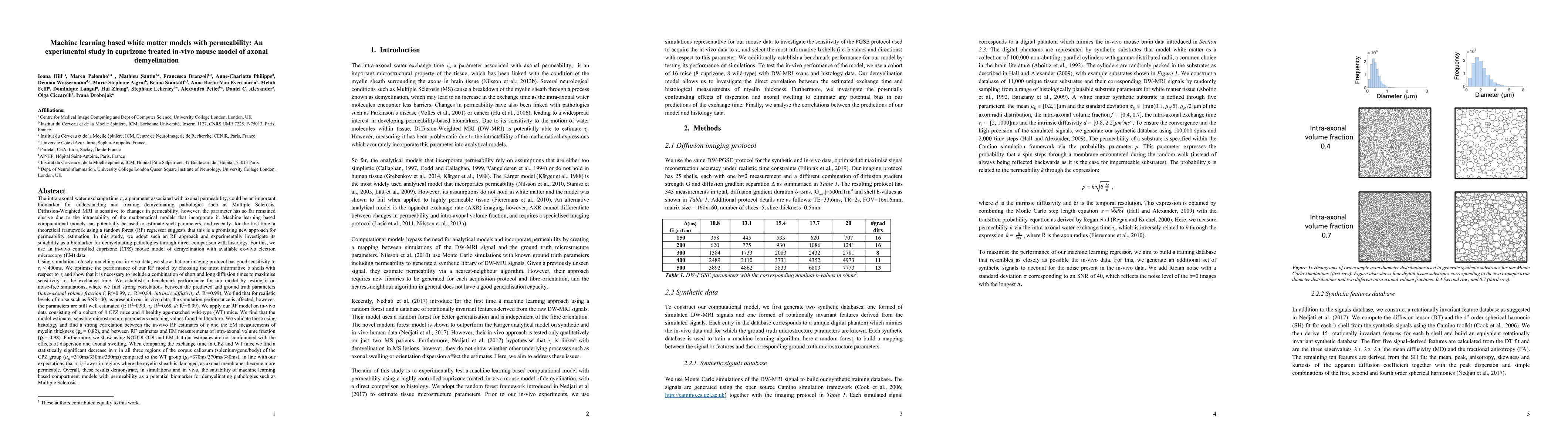 The intra-axonal water exchange time {\tau}i, a parameter associated with axonal permeability, could be an important biomarker for understanding demyelinating pathologies such as Multiple Sclerosis. Diffusion-Weighted MRI is sensitive to changes in permeability, however, the parameter has remained elusive due to the intractability of the mathematical models that incorporate it. Machine learning based computational models can potentially be used to estimate such parameters, and recently, a theoretical framework using a random forest (RF) suggests this is a promising approach. In this study, we adopt such an RF approach and experimentally investigate its suitability as a biomarker for demyelinating pathologies through direct comparison with histology. For this, we use an in-vivo cuprizone (CPZ) mouse model of demyelination with available ex-vivo electron microscopy (EM) data. We test our model on noise-free simulations and find very strong correlations between the predicted and ground truth parameters. For realistic noise levels as in our in-vivo data, the performance is affected, however, the parameters are still well estimated. We apply our RF model on in-vivo data from 8 CPZ and 8 wild-type (WT) mice and validate the RF estimates using histology. We find a strong correlation between the in-vivo RF estimates of {\tau}i and the EM measurements of myelin thickness ({\rho_\tau}i = 0.82), and between RF estimates and EM measurements of intra-axonal volume fraction ({\rho_f} = 0.98). When comparing {\tau}i in CPZ and WT mice we find a statistically significant decrease in the corpus callosum of the CPZ compared to the WT mice, in line with our expectations that {\tau}i is lower in regions where the myelin sheath is damaged. Overall, these results demonstrate the suitability of machine learning compartment models with permeability as a potential biomarker for demyelinating pathologies.