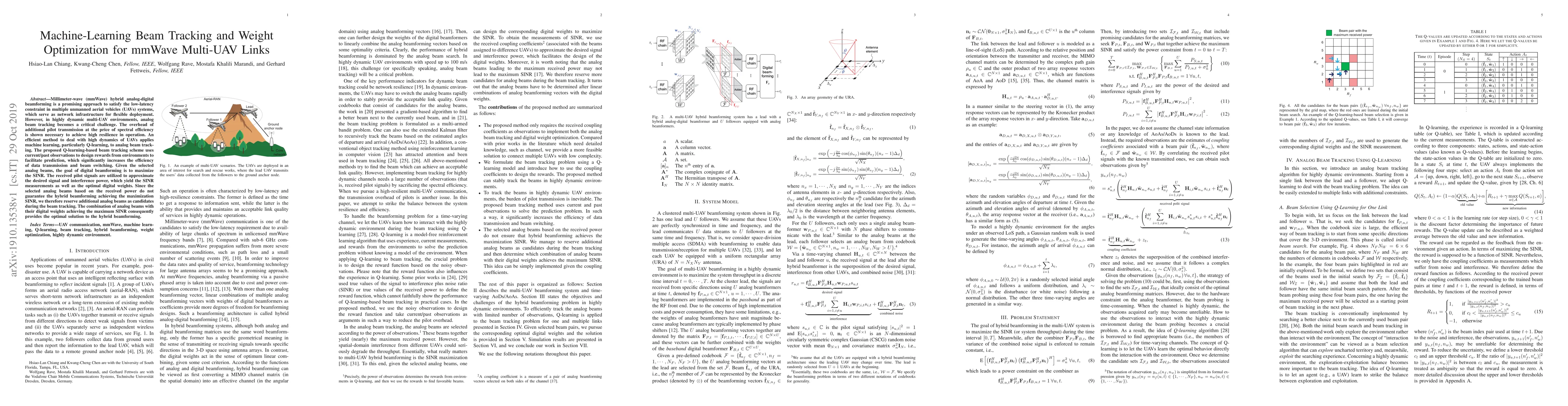 This paper proposes a Q-learning-based machine-learning method for beam tracking in mmWave multi-UAV networks to address dynamic environment challenges. It optimizes hybrid analog-digital beamforming to maximize SINR, using pilot signals for interference and desired signal power approximation.