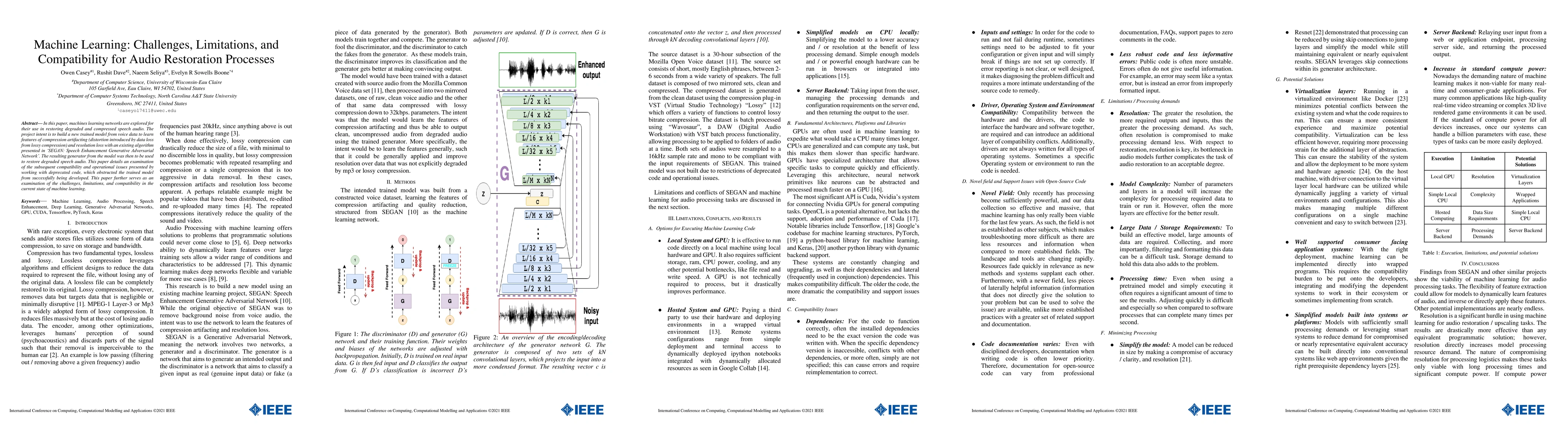 In this paper machine learning networks are explored for their use in restoring degraded and compressed speech audio. The project intent is to build a new trained model from voice data to learn features of compression artifacting distortion introduced by data loss from lossy compression and resolution loss with an existing algorithm presented in SEGAN: Speech Enhancement Generative Adversarial Network. The resulting generator from the model was then to be used to restore degraded speech audio. This paper details an examination of the subsequent compatibility and operational issues presented by working with deprecated code, which obstructed the trained model from successfully being developed. This paper further serves as an examination of the challenges, limitations, and compatibility in the current state of machine learning.