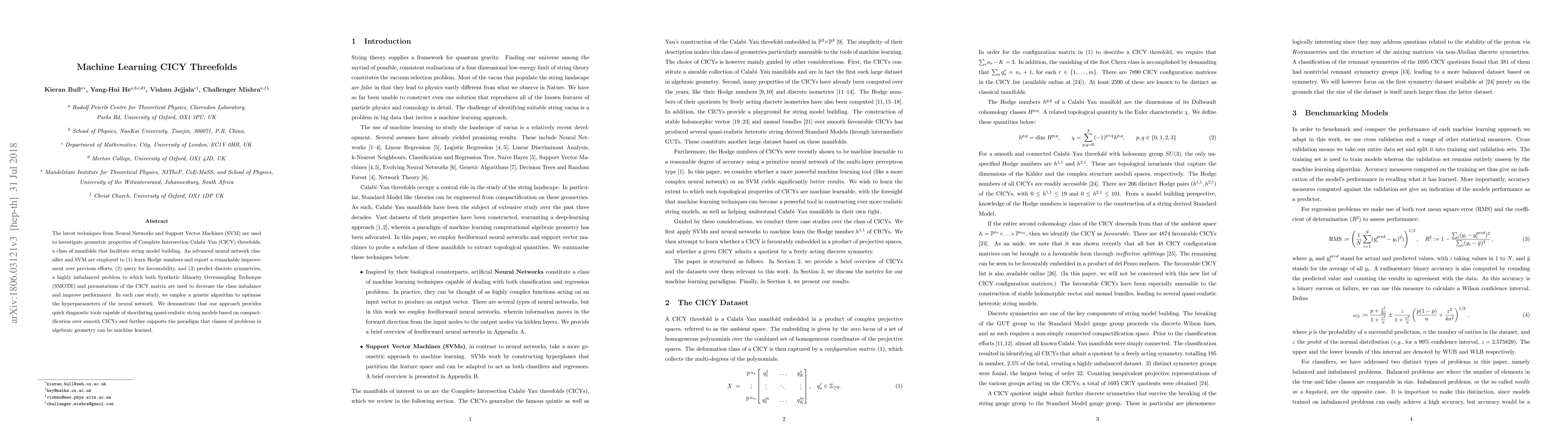 The latest techniques from Neural Networks and Support Vector Machines (SVM) are used to investigate geometric properties of Complete Intersection Calabi-Yau (CICY) threefolds, a class of manifolds that facilitate string model building. An advanced neural network classifier and SVM are employed to (1) learn Hodge numbers and report a remarkable improvement over previous efforts, (2) query for favourability, and (3) predict discrete symmetries, a highly imbalanced problem to which both Synthetic Minority Oversampling Technique (SMOTE) and permutations of the CICY matrix are used to decrease the class imbalance and improve performance. In each case study, we employ a genetic algorithm to optimise the hyperparameters of the neural network. We demonstrate that our approach provides quick diagnostic tools capable of shortlisting quasi-realistic string models based on compactification over smooth CICYs and further supports the paradigm that classes of problems in algebraic geometry can be machine learned.