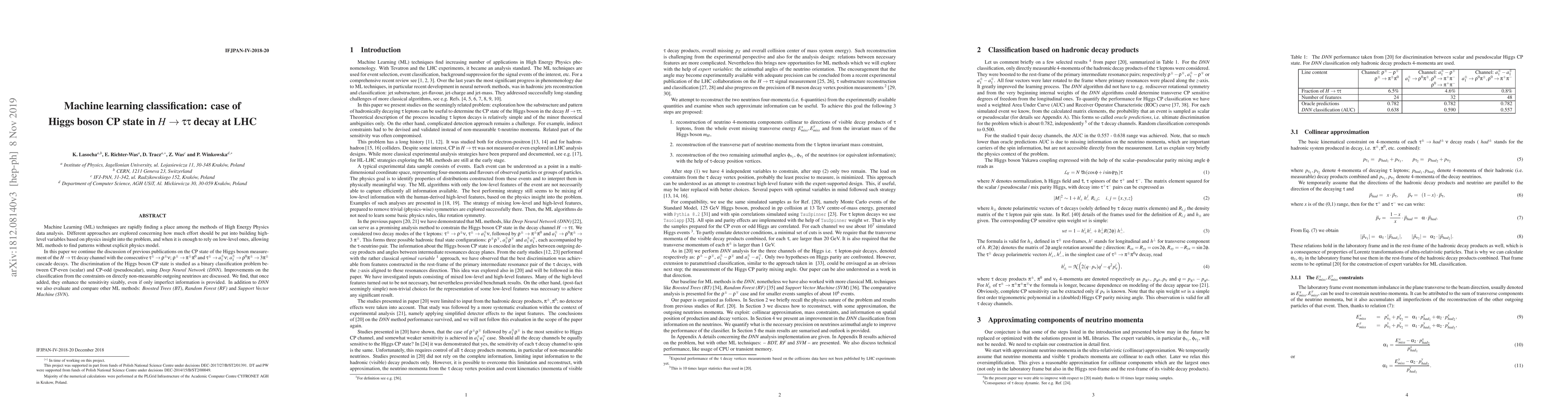 Machine Learning (ML) techniques are rapidly finding a place among the methods of High Energy Physics data analysis. Different approaches are explored concerning how much effort should be put into building high-level variables based on physics insight into the problem, and when it is enough to rely on low-level ones, allowing ML methods to find patterns without explicit physics model. In this paper we continue the discussion of previous publications on the CP state of the Higgs boson measurement of the H to tau tau decay channel with the consecutive tau^pm to rho^pm nu; rho^pm to pi^pm pi^0 and tau^pm to a_1^pm nu; a_1^pm to rho^0 pi^pm to 3 pi^pm cascade decays. The discrimination of the Higgs boson CP state is studied as a binary classification problem between CP-even (scalar) and CP-odd (pseudoscalar), using Deep Neural Network (DNN). Improvements on the classification from the constraints on directly non-measurable outgoing neutrinos are discussed. We find, that once added, they enhance the sensitivity sizably, even if only imperfect information is provided. In addition to DNN we also evaluate and compare other ML methods: Boosted Trees (BT), Random Forest (RF) and Support Vector Machine (SVN).