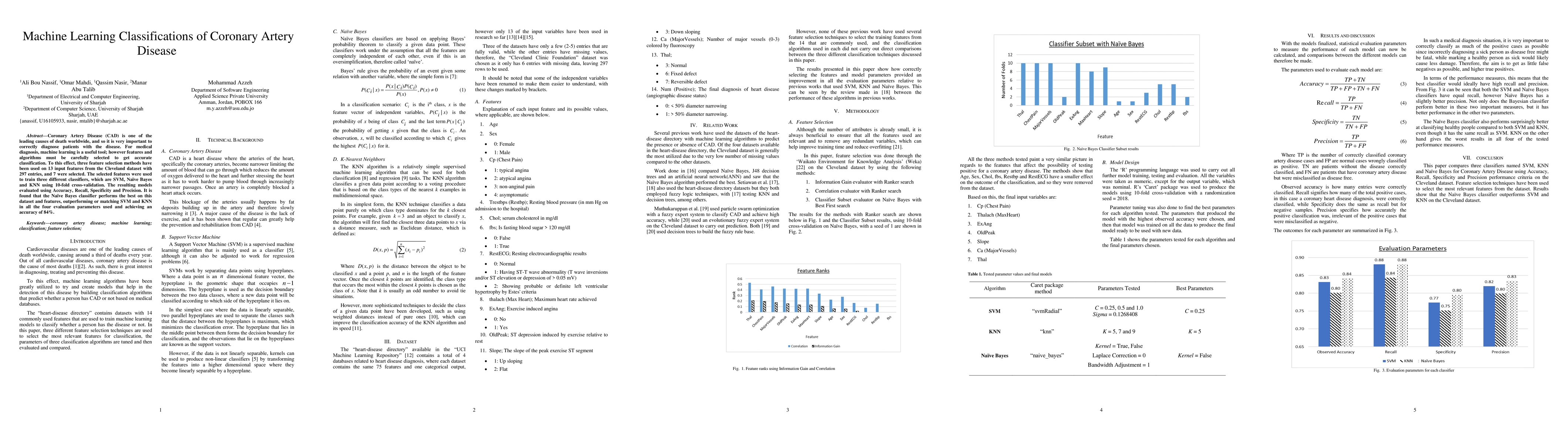 This study explores machine learning classifiers for diagnosing Coronary Artery Disease using selected features from the Cleveland dataset. The Naive Bayes classifier outperformed SVM and KNN, achieving an accuracy of 84% and excelling in Recall, Specificity, and Precision.