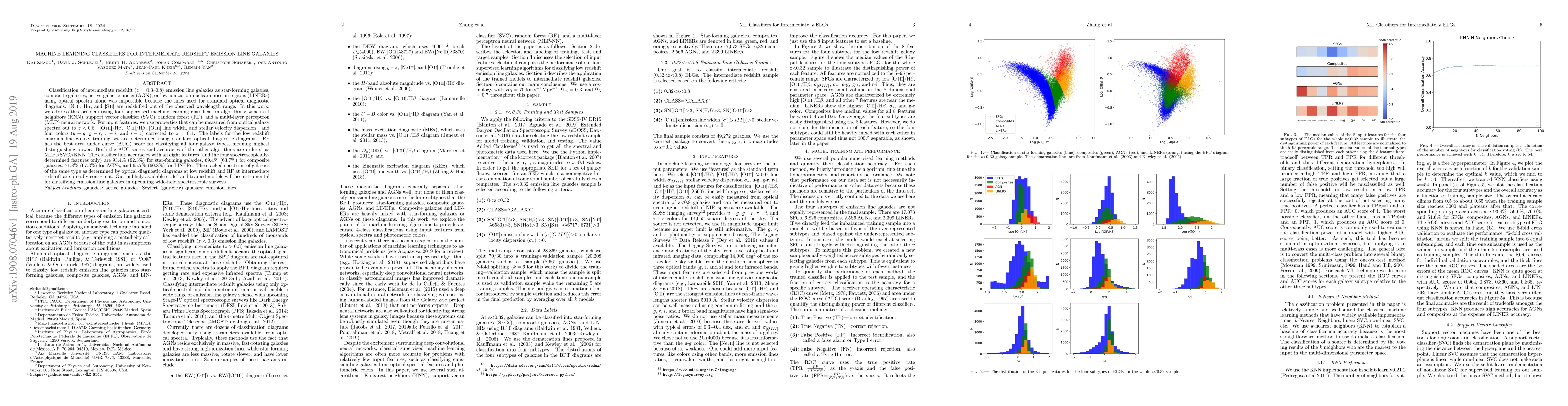 This paper employs supervised machine learning classifiers to categorize intermediate redshift emission line galaxies into four types: star-forming, composite, AGN, and LINERs. Random forest (RF) achieves the highest classification accuracy, outperforming KNN, SVC, and MLP, with accuracies ranging from 65.7% to 93.4%. The authors' code and trained models are made publicly available for future spectroscopic surveys.