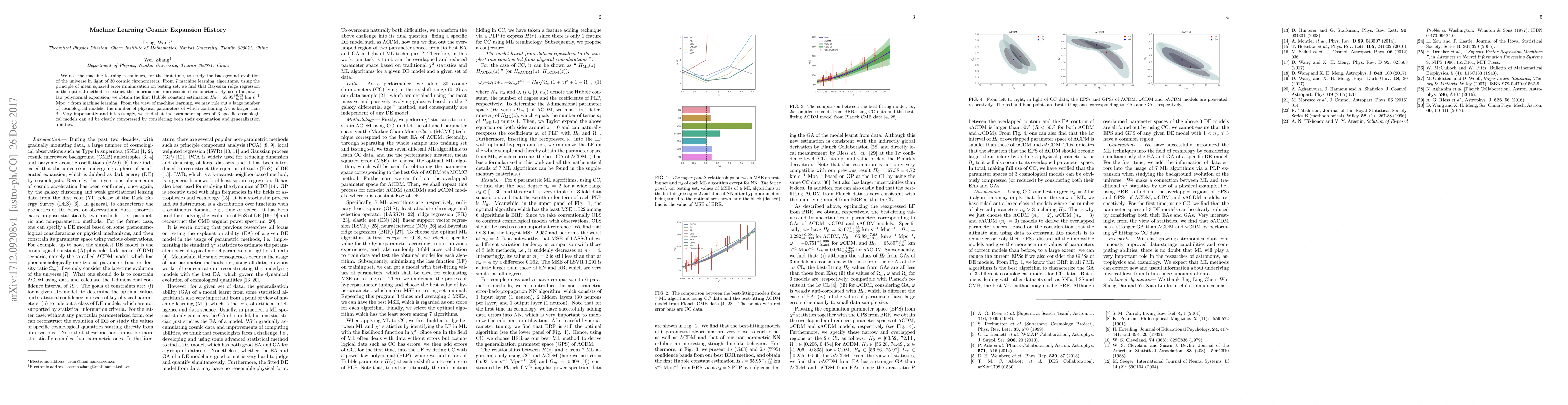 We use the machine learning techniques, for the first time, to study the background evolution of the universe in light of 30 cosmic chronometers. From 7 machine learning algorithms, using the principle of mean squared error minimization on testing set, we find that Bayesian ridge regression is the optimal method to extract the information from cosmic chronometers. By use of a power-law polynomial expansion, we obtain the first Hubble constant estimation $H_0=65.95^{+6.98}_{-6.36}$ km s$^{-1}$ Mpc$^{-1}$ from machine learning. From the view of machine learning, we may rule out a large number of cosmological models, the number of physical parameters of which containing $H_0$ is larger than 3. Very importantly and interestingly, we find that the parameter spaces of 3 specific cosmological models can all be clearly compressed by considering both their explanation and generalization abilities.