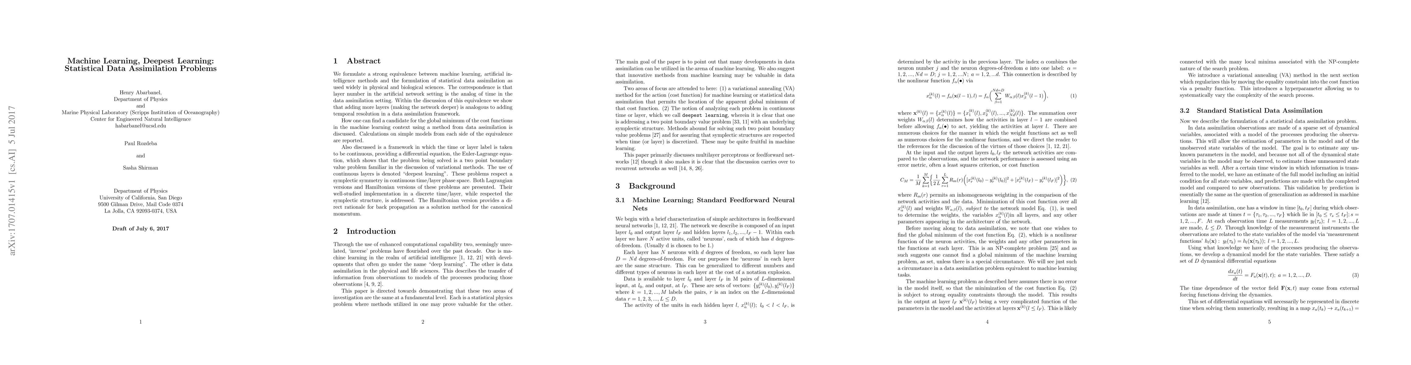 This paper establishes a strong equivalence between machine learning and statistical data assimilation, showing that deeper networks correspond to higher temporal resolution in data assimilation. It also introduces "deepest learning" using continuous layers, framed as a symplectic two-point boundary value problem, and rationalizes backpropagation through a Hamiltonian perspective.